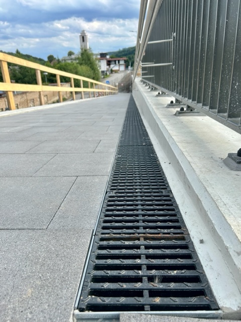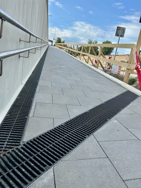 Projekční tým MEA Water Management navrhl pro svod dešťové vody žlaby z velmi odolného polymerického betonu s žárově pozinkovanými ochrannými hranami, MEADRAIN SV.