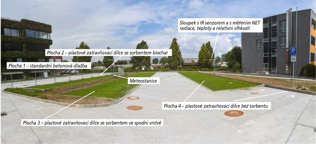 Za tímto účelem bylo na parkovišti před budovou fakulty Životního prostředí České zemědělské univerzity v Praze vybudováno parkoviště o kapacitě 54 parkovacích stání. Z toho 38 stání jako zatravněné. Byly použity čtyři typy skladeb povrchů umístěných v těsné blízkosti. Jako referenční plocha bylo vybudováno parkoviště z betonové dlažby.