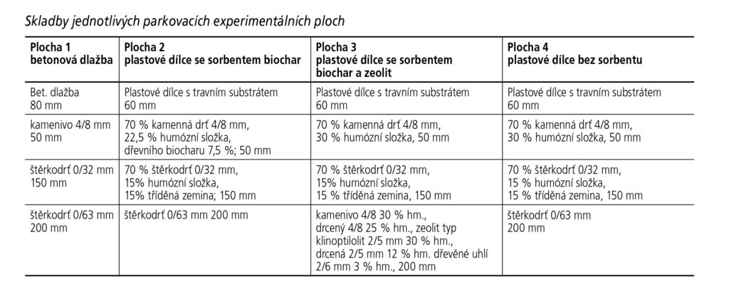 Tři různé typy zatravněných parkovišť s plastovými vegetačními dílci se pak liší typem použitého sorbentu a sorpčních vrstev v ložné, respektive podkladní vrstvě. Vegetační vrstva je u všech tří zatravněných parkovacích ploch identická – tvořená plastovými vegetačními rošty (60 mm) vyplněnými trávníkovým substrátem a osazené travní směsí. Podrobný popis jednotlivých vrstev je popsán v tabulce.