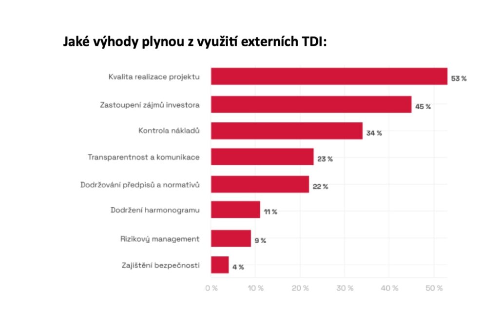 Podle dotázaných projektových společností hlavní výhody využívání externího technického dozoru spočívají právě v kvalitě realizace, v zastupování zájmů investora, což úzce souvisí s kontrolou nákladů, dále v transparentnosti a dodržování předpisů.