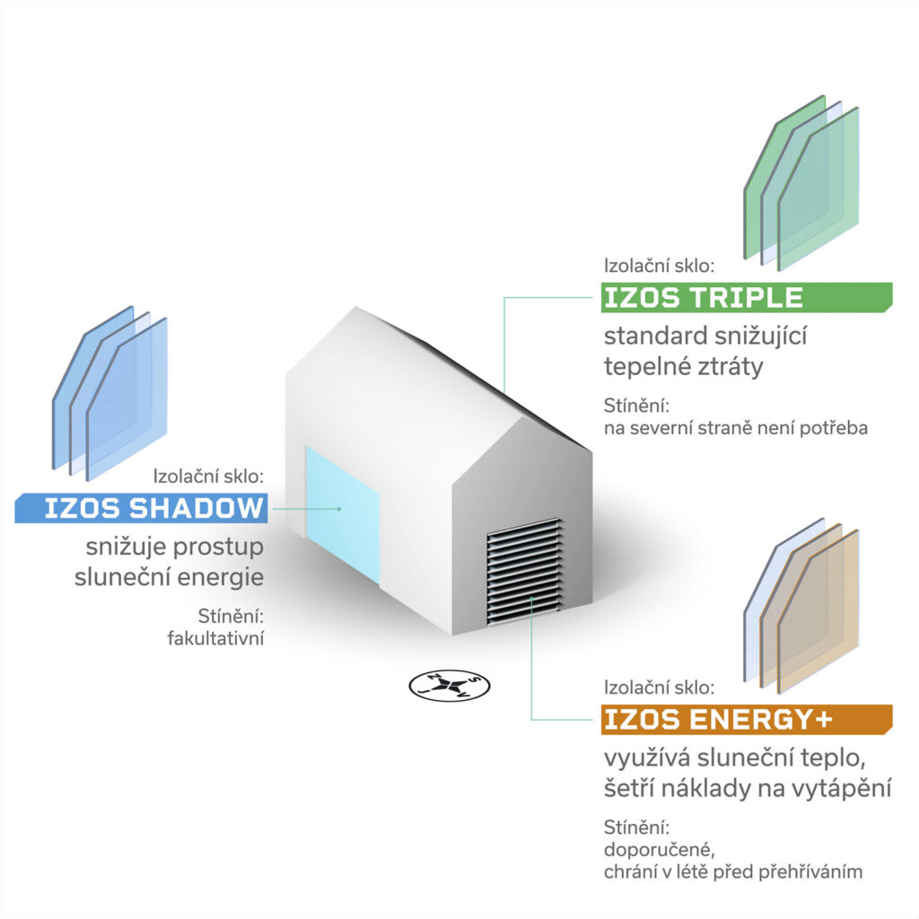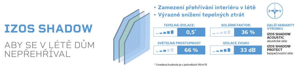 Zasklení může mít ale zcela opačný efekt, a to tlumení prostupu tepla do interiéru – v místech, kde například není možné používat stínicí techniku, je vhodné instalovat zasklení IZOS SHADOW s vyšší odrazivostí, které zabraňuje přehřívání interiéru. Stavebníkovi to zajistí nemalou úsporu za klimatizování prostor. Nová generace multifunkčního nízkoemisního a protislunečního pokovení zajišťuje zasklení neutrální vzhled a nízkou reflexi, který nijak negativně neovlivňuJe architekturu domu.
