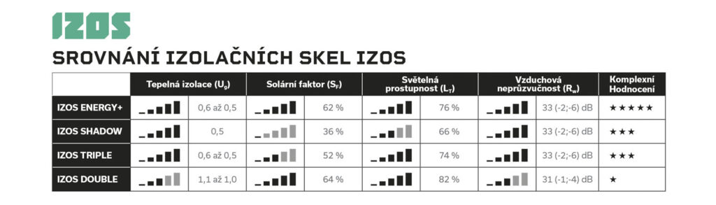 Možnosti současných izolačních skel jsou nejlépe patrné při porovnání s dvojsklem se součinitelem prostupu tepla zasklení Ug = 1,6 W/m2K, což byla na tehdejší dobu dobrá hodnota pro běžné zasklení kolem roku 2000. Dnes již téměř standardní zasklení – tedy trojsklo IZOS TRIPLE – má již Ug = 0,5 W/ m2K. Při venkovní teplotě −7,5 °C dosáhne rozdíl teploty vnitřního skla více než 3 °C. Každý 1 °C přitom představuje rozdíl v nákladech na vytápění mezi 7 až 8 %, takže v případě těchto dvou výrobků hovoříme o rozdílu v nákladech na vytápění kolem 25 %. Sklo IZOS ENERGY+ se součinitelem prostupu tepla Ug = 0,5 W/m2K a solárním faktorem 62 % pak vylepšuje tuto hodnotu o dalších cca 17 %. Díky tomuto izolačnímu sklu je možné využití solárních zisků v zimním období zdarma. Řešení přehřívání interiéru v letních měsících zase ukazuje porovnání zasklení IZOS TRIPLE a IZOS SHADOW. V případě, že majitel domu nechce nebo nemůže řešit stínění pomocí předokenních žaluzií, může zvolit sklo IZOS SHADOW se schopností odrazivosti sluneční paprsků a se solárním faktorem sníženým na hodnotu 36 %. Při venkovní teplotě blížící se hodnotě 40 °C je teplota vnitřního zasklení 20,5 °C, tedy o více než 1 °C méně než u izolačního skla IZOS TRIPLE. S tím jde ruku v ruce klesající potřeba energie na chlazení interiéru.