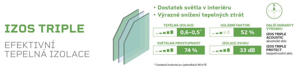Tato izolační skla se hodí pro menší zasklené plochy a jsou již standardem pro dnešní novostavby. Tvoří jej tři skleněné tabule a dva distanční rámečky. Jsou vhodná pro zasklívání plastových, dřevěných a hliníkových oken i portálů. Díky hodnotě prostupu tepla Ug 0,6 až 0,5 přispívá IZOS TRIPLE k energetickým úsporám v objektu. Zároveň stále propouští dostatek světla. Parametry trojskla splňují požadavky jak na novostavby, tak na rekonstrukce s výrazným snížením energetické náročnosti. Doporučeno pro zasklívání ploch s orientací na sever, protože neumožňují využívat sluneční energii.