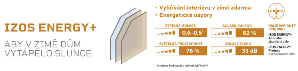 Izolační skla IZOS ENERGY+ představují velký potenciál především v zimních měsících, kdy díky nim můžeme získávat pasivní solární zisky – tepelnou energii ze slunečního záření – a významně tak snížit provozní náklady budovy. Jižní, východní, případně i západní strany domů by proto měly být osazeny skly s vysokou propustností tepla ze slunečního záření, v ideálním případě v kombinaci se stínicí technikou, která zamezí přehřívání místností v létě. U správně navrženého projektu toto izolační zasklení tak může omezit či zcela eliminovat technologie pro dodatečné zdroje tepla.