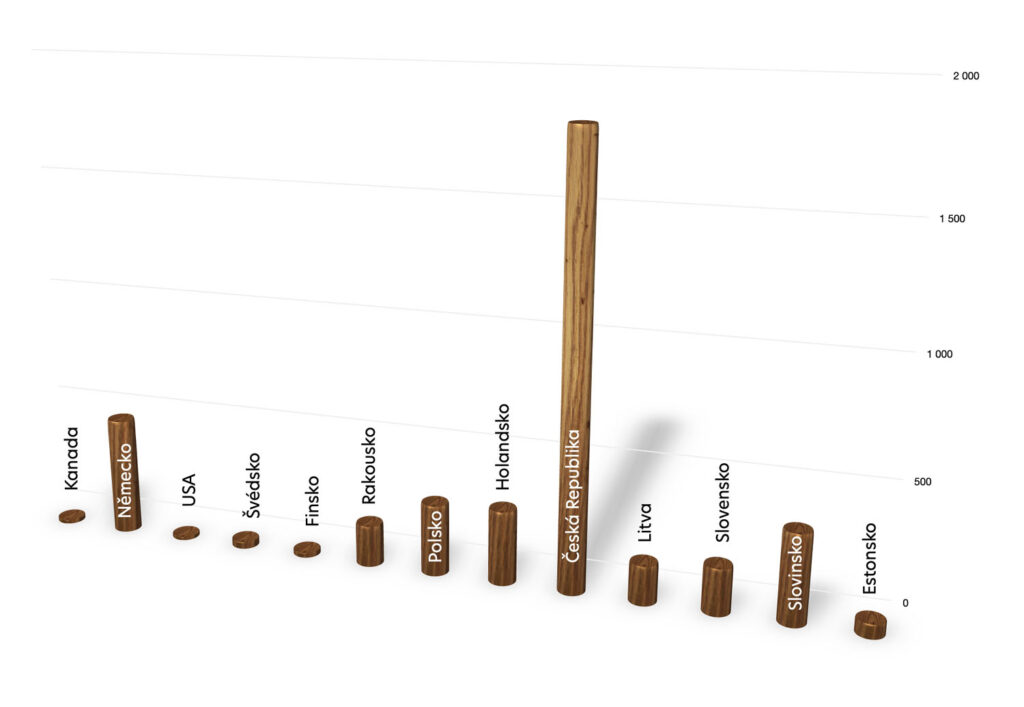 POZN.: Graf srovnání zemí dle míry exportu kulatiny (m3) vztažené na plochu lesů (ha) vychází z informací exportu kulatiny v letech 2022 a 2023 (číslo bylo u jednotlivých zemí zprůměrováno) zveřejněné MZE (Zpráva o stavu lesa a lesního hospodářství), plocha lesů jednotlivých států je dle dat UNECE https://forest-data.unece.org/Indicators/1 – v případě ČR ověřeno i dle dat MZE