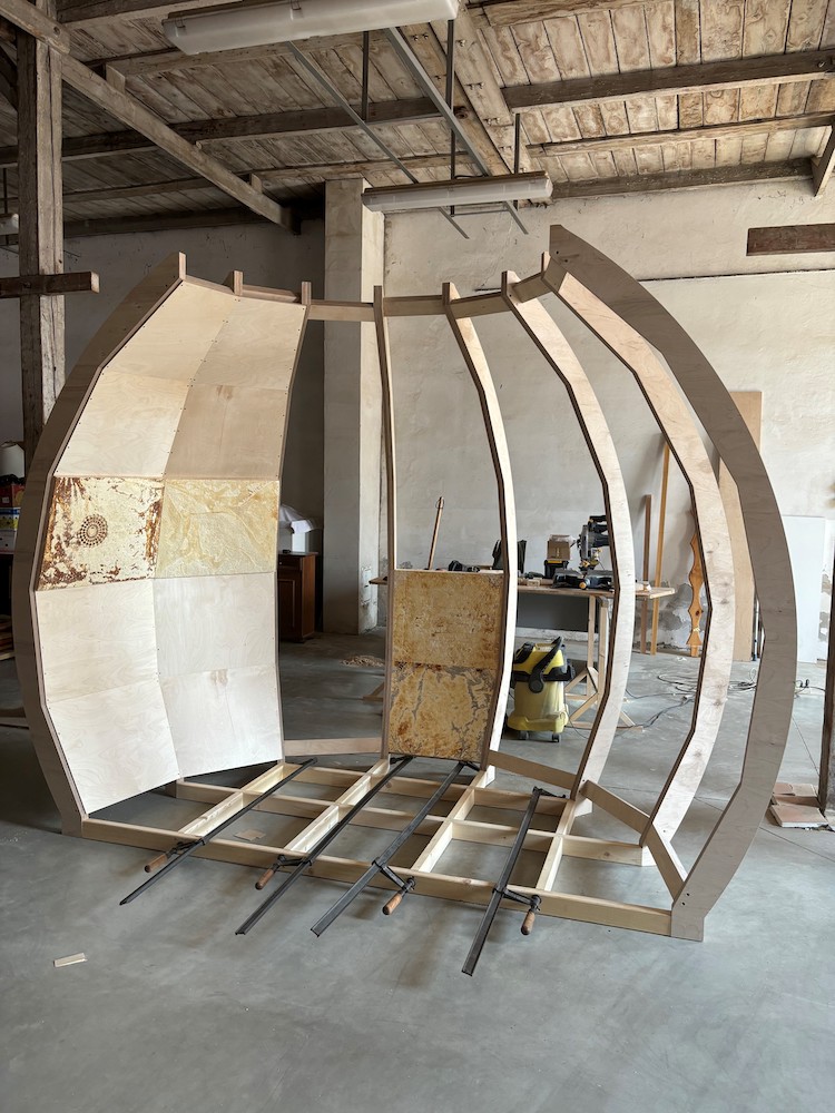 Stavbu prvního domu z mycelia ohlásila Buřinka na jaře roku 2024. Nyní dům SAMOROST získává konkrétní podobu. V tuto chvíli stojí již osm dřevěných žeber prvního modulu (kuchyně), které jsou základem nosné konstrukce. Mezi jednotlivá žebra spojená překližkou se postupně vsazují myceliové desky. V interiéru budou plnit funkci zvukového izolantu a současně budou výjimečným designovým doplňkem. Uvnitř stěny pak budou plnit funkci izolantu tepelného. Mykokompozitní materiál tak kompletně nahrazuje polystyren.