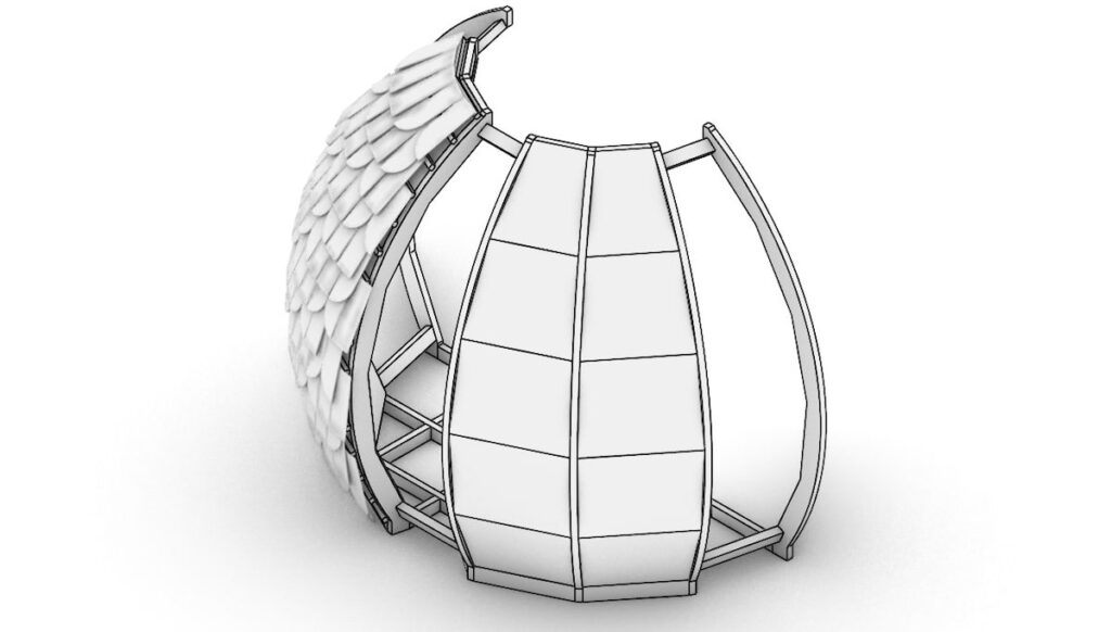 4. Vnější obklad: uchycení mycelia a latí vně domu pro přichycení šindelů
