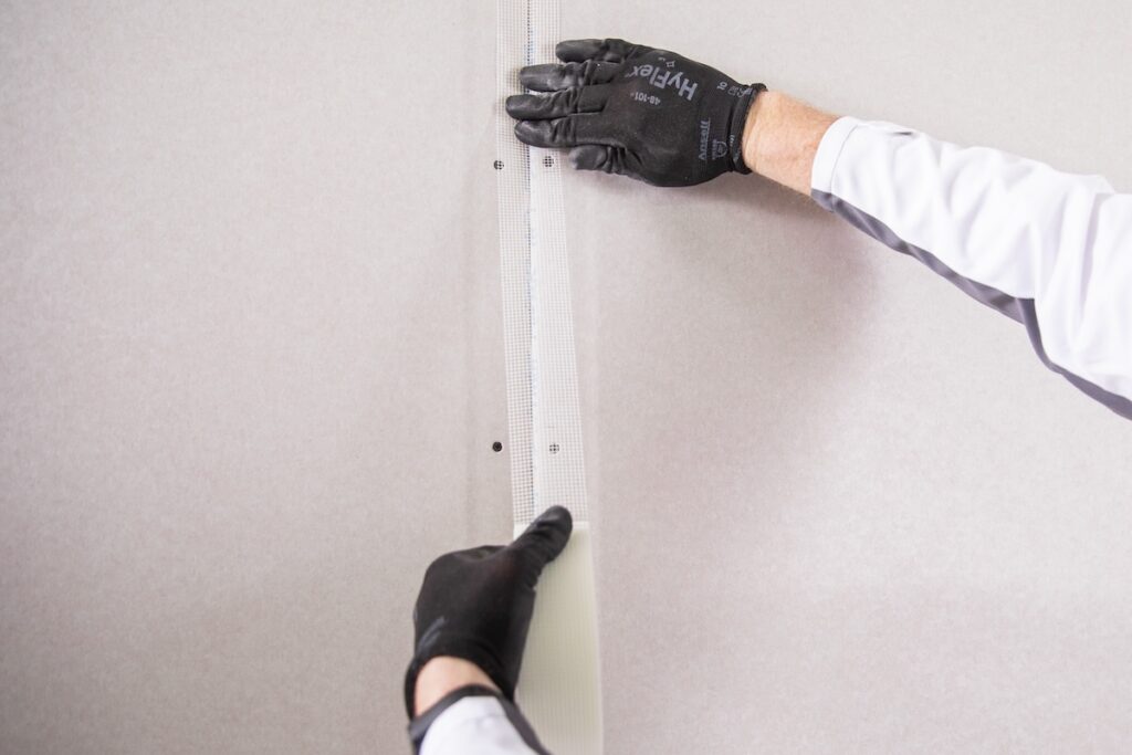 Spárování sádrokartonu za použití samolepicí skelné mřížky a spárování tmelem přes samolepicí skelnou mřížku