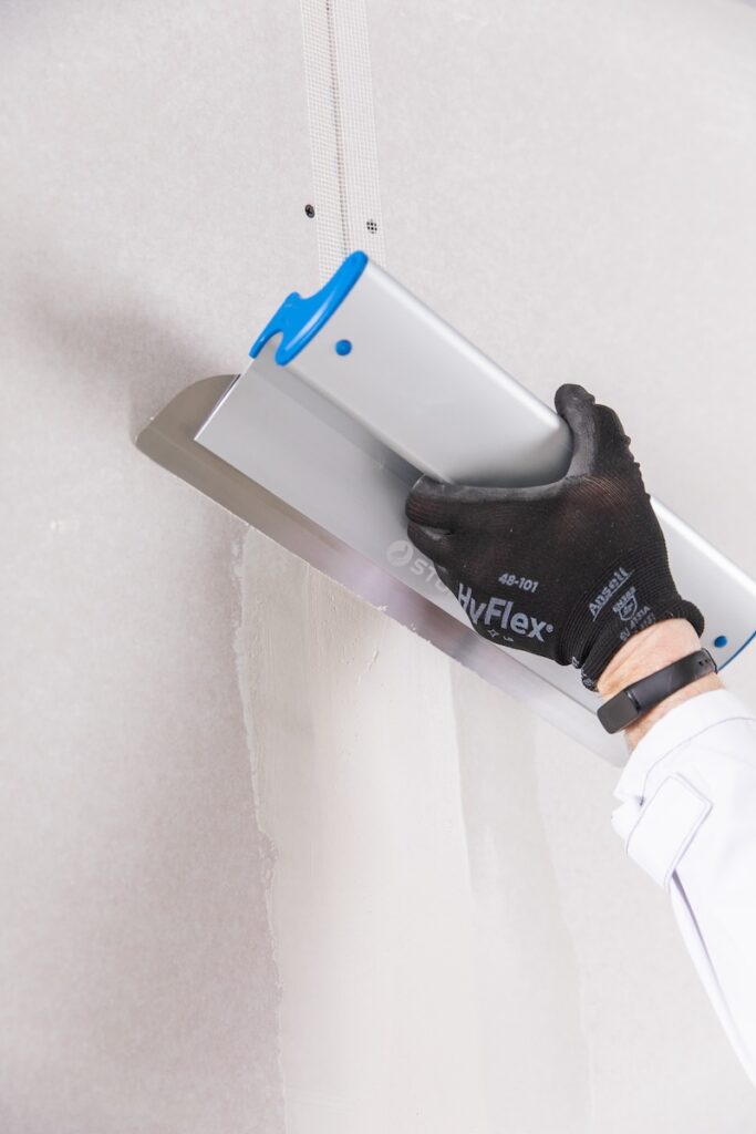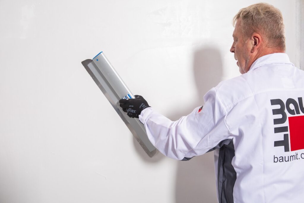 Pokud se rozhodneme pro pytlovaný sypký materiál, pak je řešením sádrový stěrkovací tmel Baumit FinoGrande. Tato původně suchá směs je po rozmíchání s vodou (ručně nebo pomocí přístroje) ve své smetanové konzistenci vhodná pro natažení s tloušťkou v rozmezí 2–6 mm. Následně lze tuto poměrně rychle schnoucí stěrku doplnit např. vysoce paropropustnou interiérovou barvou Baumit KlimaColor. U sádrokartonových podkladů, starých omítek či disperzních nátěrů bychom neměli opomenout přípravu takového podkladu, a to základními nátěry Baumit Grund nebo Baumit SuperPrimer. Chceme-li si dosažení zcela hladkých povrchů stěn ulehčit z pohledu pracnosti i času, pak je řešením jemná pastovitá vyhlazovací stěrka na bázi organických pojiv Baumit FinishExpert, nabízená v již finálně namíchaném stavu, a tedy rovnou připravená na strojní či ruční aplikaci. I v tomto případě lze následně použít v podstatě jakoukoliv interiérovou barvu tohoto renomovaného výrobce stavebních materiálů.