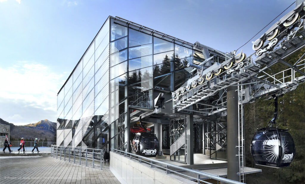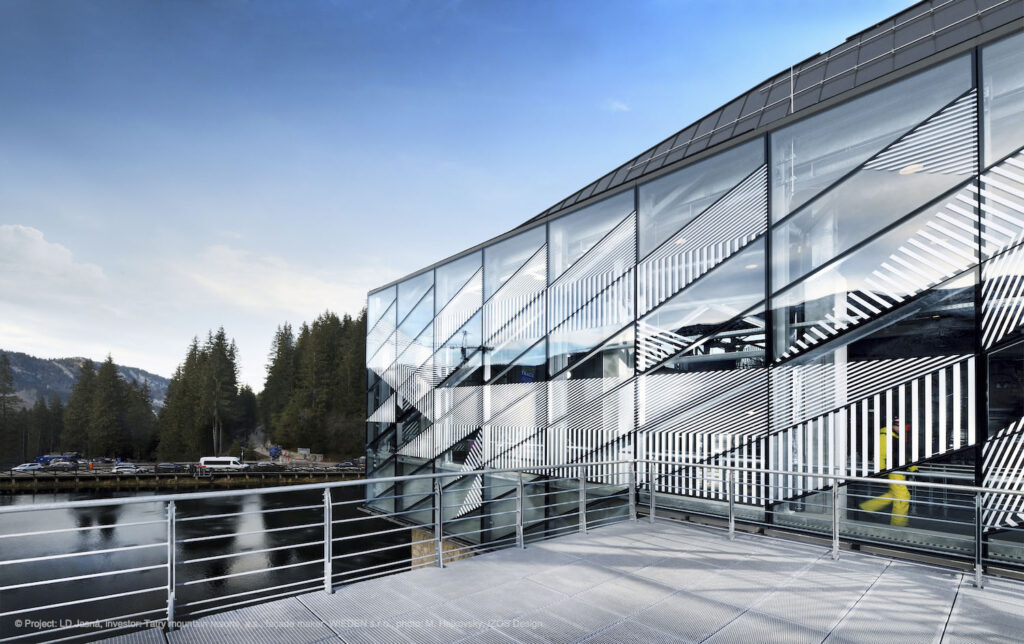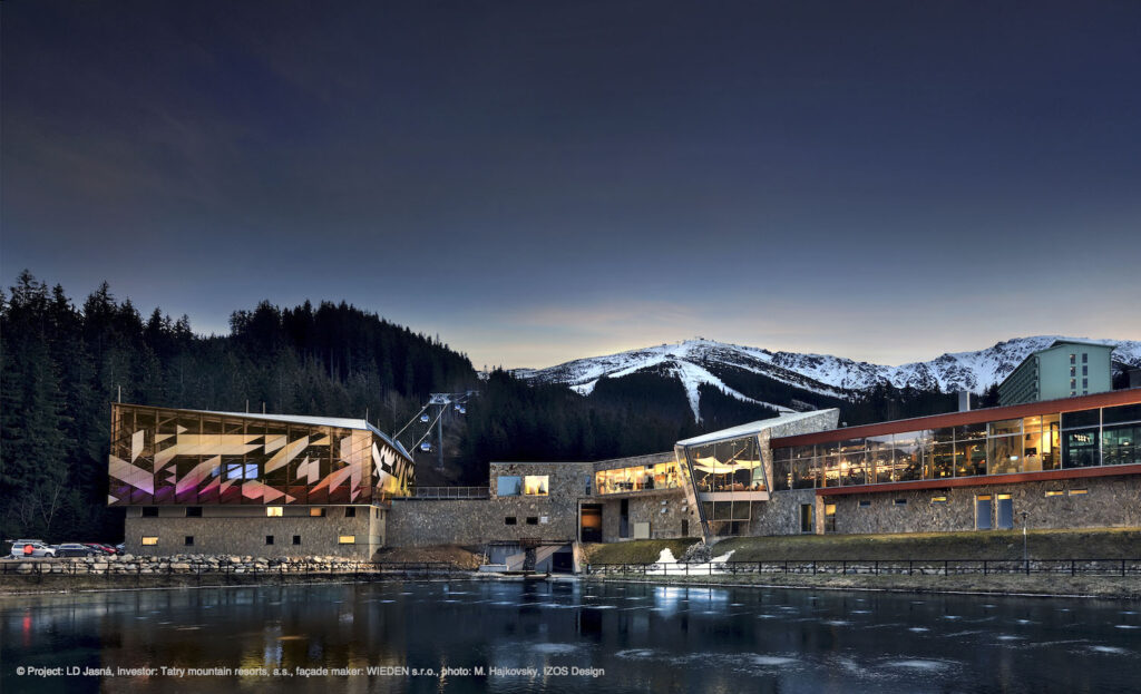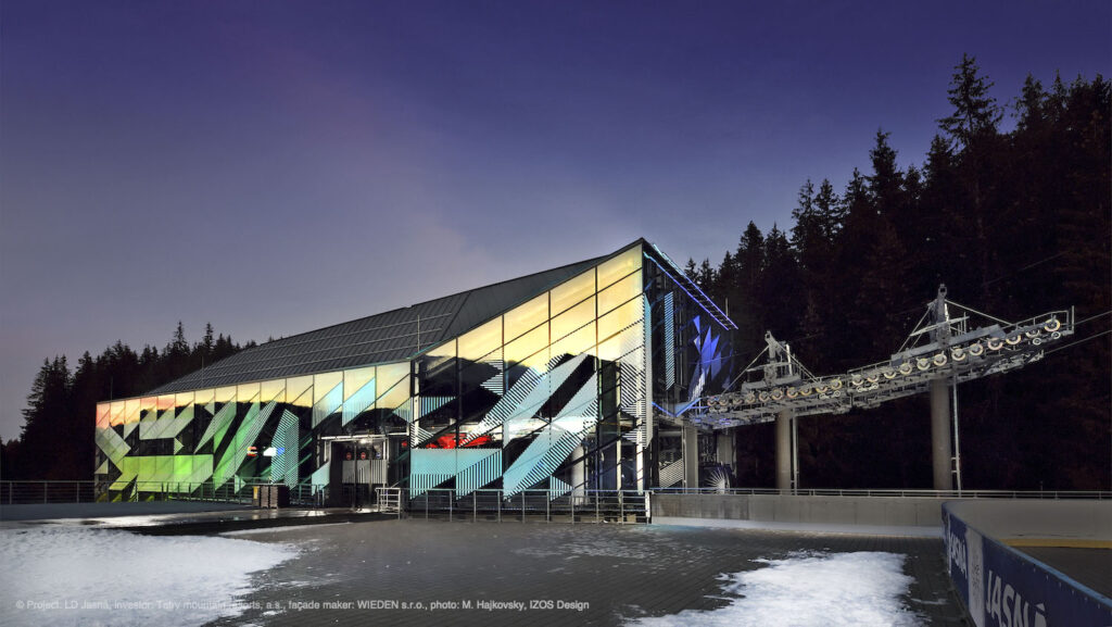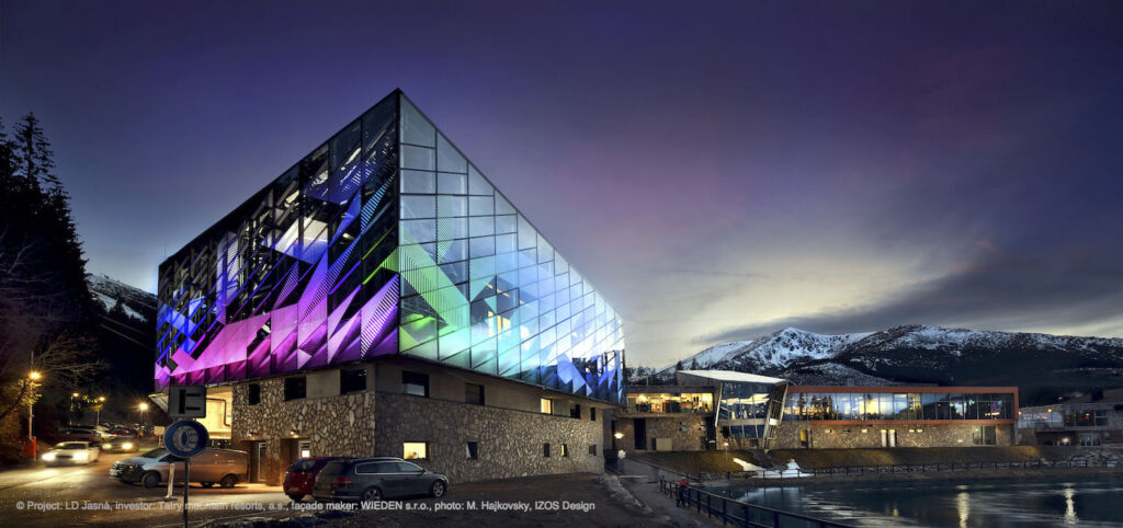 Současné architektuře vládnou neutrální a přírodní odstíny, aktuální je přirozená podoba použitých materiálů. Výrazné barvy tak často nevídáme. Architektonické řešení dolní stanice lanovky v lyžařském areálu Jasná v nízkých Tatrách překvapuje kombinací obojího: přes den objektu vládne jednoduchost a přirozenost, kdy fasádě z extra čirého skla dodává hloubku grafický potisk v bílé barvě. Ve večerních hodinách se plášť budovy pomocí nasvícení mění v barevný krystal a přináší tak návštěvníkům nevšední vizuální zážitek. Potisk skel o ploše 1500 m2 byl realizován v závodě společnosti HELUZ IZOS. „Metodou digitálního tisku lze vyrobit designová skla s libovolnými motivy i barvami, od jednoduchých vzorů až po celoplošný potisk dle fotografie,“ představuje IZOS Design Andrea Stejskalová ze společnosti HELUZ IZOS a dodává: „Prostup světla je přitom zachován.“