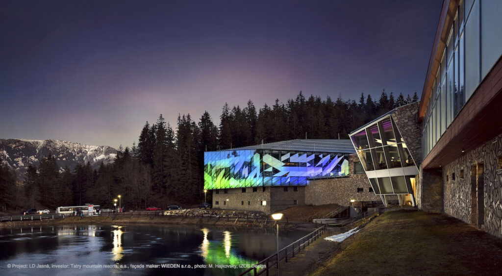 Ve dne neutrální a přírodní vzhled, večer dechberoucí barevné divadlo. V každé denní době je pohled na prosklený objekt lanové dráhy ve slovenské Jasné architektonickým zážitkem. Technologie IZOS Design, která umožňuje vytvořit na skleněném povrchu jakýkoliv originální dekor, dodala fasádě budovy lanovky hloubku i dynamiku.