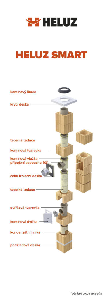 To platí pro obě velikosti, jak o průměru izostatické vložky 160 mm, tak i 180 mm, což jsou dnes nejžádanější průměry vložek. Veškeré komponenty jsou skladem a připraveny ke kompletaci, což umožňuje maximálně zkrátit dobu dodání. V komínovém kompletu je přibalena veškerá potřebná dokumentace, jejíž součástí je revizní štítek a podrobný montážní návod. Součástí je i návod na zabudování komína do stavby s ohledem na bezpečnou vzdálenost hořlavých konstrukcí od pláště komína, který byl vypracován na základě výsledků zkoušek podle nových norem. Je v něm uvedeno, jak správně zhotovit prostup komína skrz stropní konstrukci a jak komín bezpečně umístit u stěny, aby při jeho provozování nevzniklo žádné požární nebezpečí. Komínový systém HELUZ SMART je dodáván s krycí deskou, která umožňuje provedení povrchové úpravy až do tl. 5 cm.