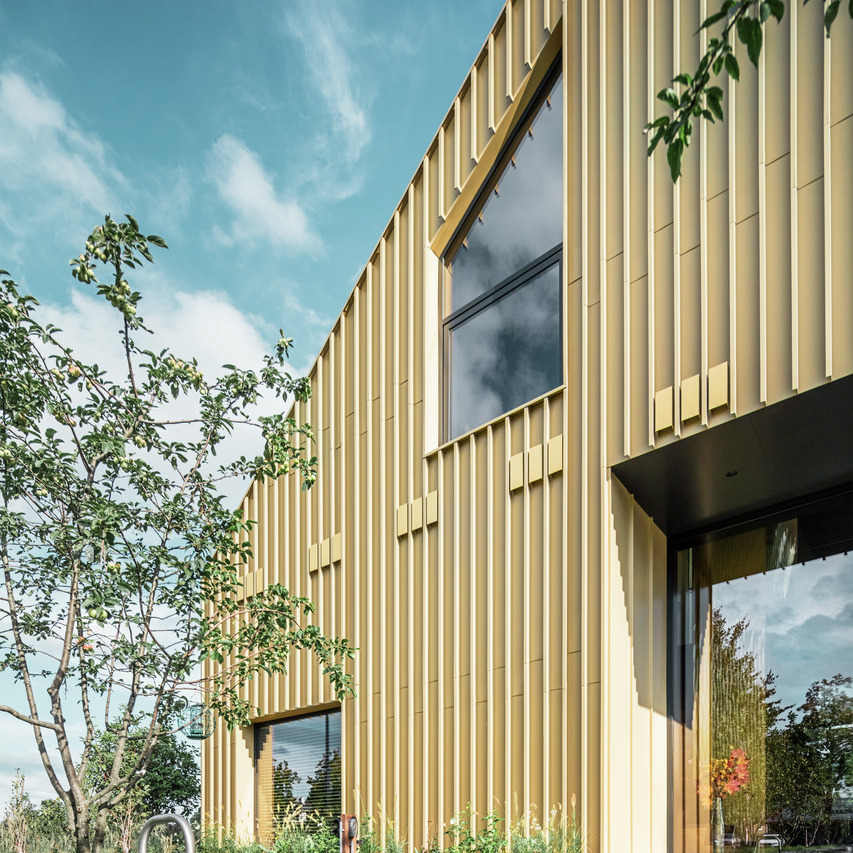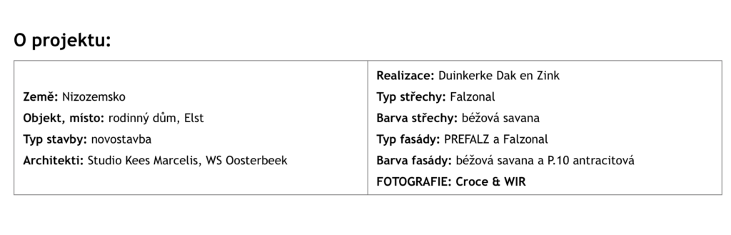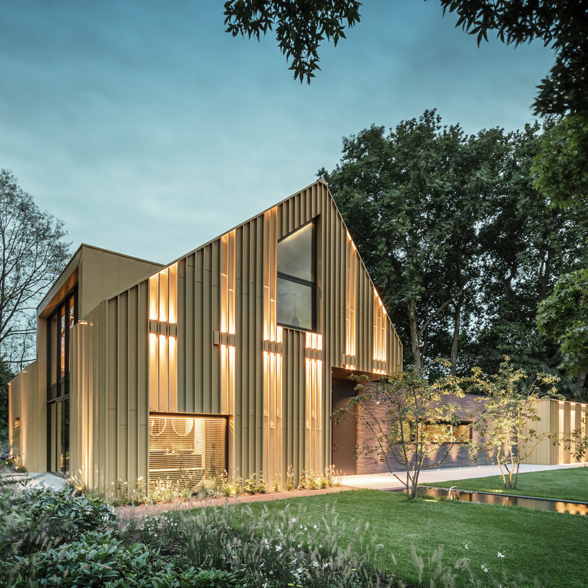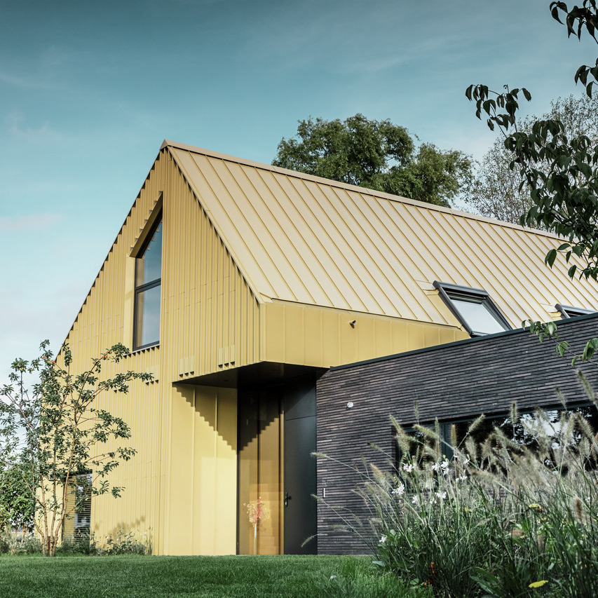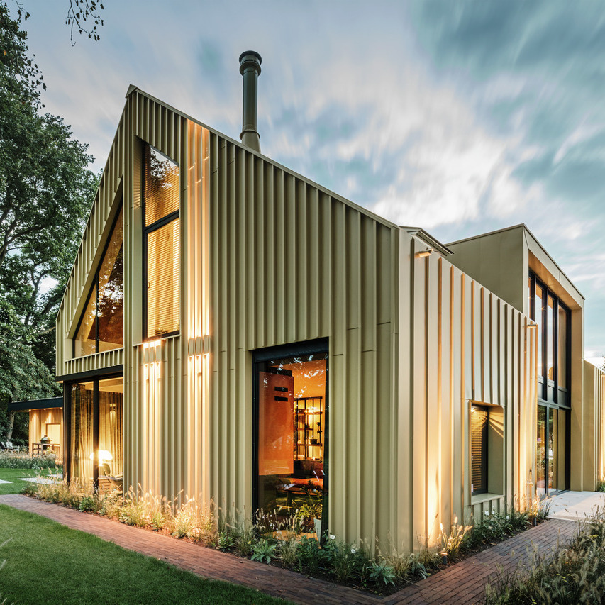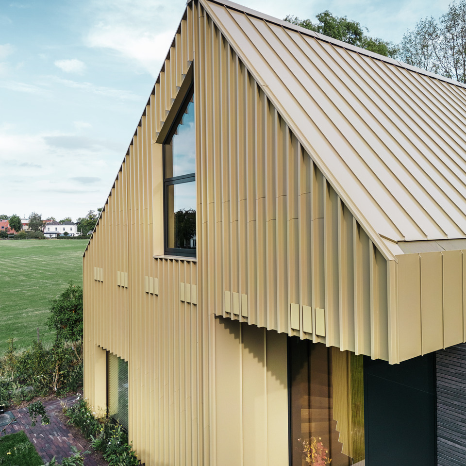 Architekt Kees Marcelis se ve svých návrzích vyznačuje vždy precizní a vyladěnou souhrou všech použitých materiálů. Do interiéru svého nového domu v Elstu zvolil ušlechtilé povrchy tmavších odstínů včetně velkoplošných reliéfních tapet. O to důležitější pro něj pak bylo navrhnout světlý a jasný plášť budovy – jako kontrast k interiéru. Použil proto hliníkové plechy PREFALZ a Falzonal ve vysoce reflexní béžové savana barvě, které nechal instalovat ve formě svislých dekorativních pásů, tzv. lizén. Ty strukturují a zdůrazňují nejenom vysokou kvalitu kovové krytiny, ale také celistvou formu domu bez střešních přesahů. Sám Marcelis říká, že: „Lidské oko sleduje pravidelné svislé linie a objevuje v nich eleganci a velkorysost. Rovněž je fascinováno plynulostí, která je takovým liniím vlastní.“ Pro zpestření nechal na štítových stěnách realizovat stojaté drážky vysoké 70 mm namísto obvyklých 25 mm. Dodávají budově prostorovou hloubku a pravidelný rytmus, který je sporadicky přerušován svítidly integrovanými ve fasádě. Přes den, v závislosti na poloze slunce, vzniká díky vysokým drážkám zajímavá hra světla a stínů. Naopak v noci, když fasádní svítidla svítí, je kompozice pevně strukturovaná do pravoúhlého lizénového rámu, který umocňuje nejenom vertikální, ale také horizontální rozměr stavby. V noci se tak budova stává opticky větší než ve dne.