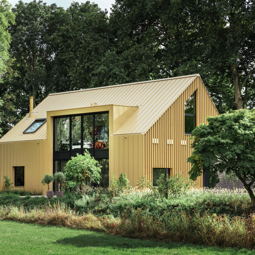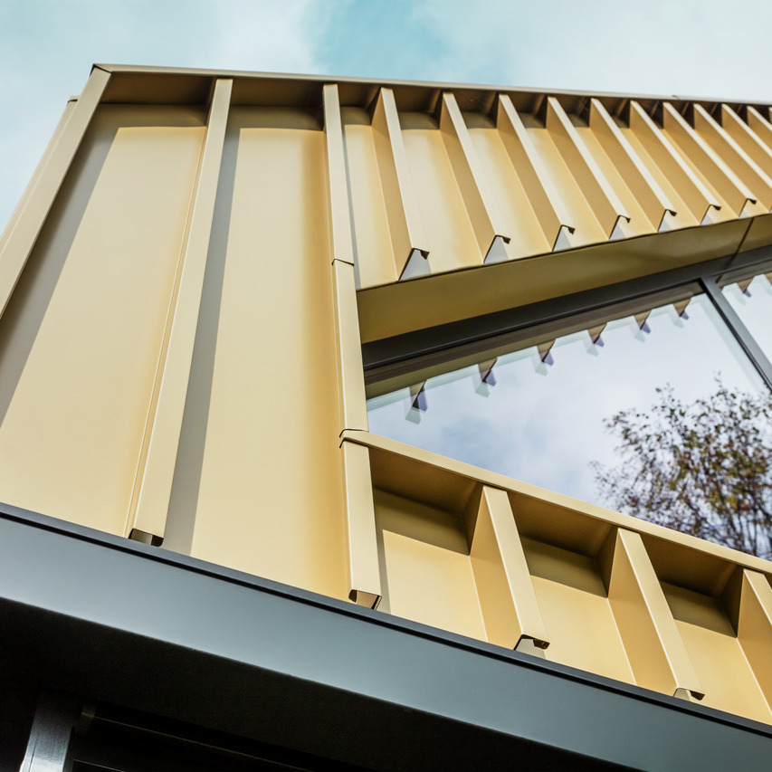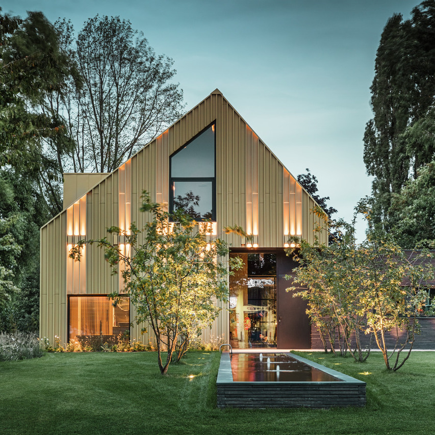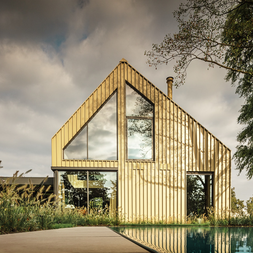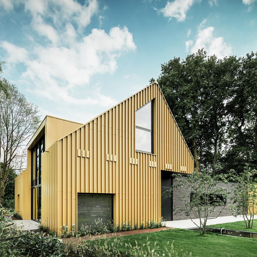 Architekt Kees Marcelis se ve svých návrzích vyznačuje vždy precizní a vyladěnou souhrou všech použitých materiálů. Do interiéru svého nového domu v Elstu zvolil ušlechtilé povrchy tmavších odstínů včetně velkoplošných reliéfních tapet. O to důležitější pro něj pak bylo navrhnout světlý a jasný plášť budovy – jako kontrast k interiéru. Použil proto hliníkové plechy PREFALZ a Falzonal ve vysoce reflexní béžové savana barvě, které nechal instalovat ve formě svislých dekorativních pásů, tzv. lizén. Ty strukturují a zdůrazňují nejenom vysokou kvalitu kovové krytiny, ale také celistvou formu domu bez střešních přesahů. Sám Marcelis říká, že: „Lidské oko sleduje pravidelné svislé linie a objevuje v nich eleganci a velkorysost. Rovněž je fascinováno plynulostí, která je takovým liniím vlastní.“ Pro zpestření nechal na štítových stěnách realizovat stojaté drážky vysoké 70 mm namísto obvyklých 25 mm. Dodávají budově prostorovou hloubku a pravidelný rytmus, který je sporadicky přerušován svítidly integrovanými ve fasádě. Přes den, v závislosti na poloze slunce, vzniká díky vysokým drážkám zajímavá hra světla a stínů. Naopak v noci, když fasádní svítidla svítí, je kompozice pevně strukturovaná do pravoúhlého lizénového rámu, který umocňuje nejenom vertikální, ale také horizontální rozměr stavby. V noci se tak budova stává opticky větší než ve dne.