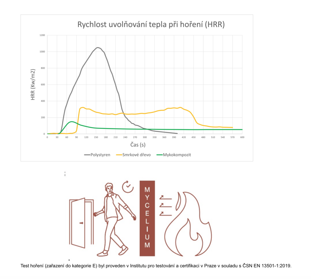 Testování na hoření určuje, zda a jakým způsobem zkoumaný materiál přispívá k šíření ohně. „Průběh hoření mykokompozitu je nejvíce podobný dřevu. Dřevo hoří snadno a rychle, zatímco mykokompozit postupně oddoutnává a ztrácí své pevnostní kvality pomaleji. Při požáru tak mykokompozit zajistí delší čas k úniku,“ vysvětluje Jakub Seifert ze spolku MYMO, který zajišťuje výzkumnou a vývojovou část projektu Samorost, a doplňuje: „Při hoření materiál neodkapává, ani neprská žhavé kapky do okolí. Dosavadní test potvrdil základní klasifikaci na oheň v kategorii E. Naší ambicí je dostat se díky dalším testům až do kategorie C, čímž potvrdíme, že mykokompozit má mnohem lepší požární vlastnosti než dřevotříska či OSB deska.“