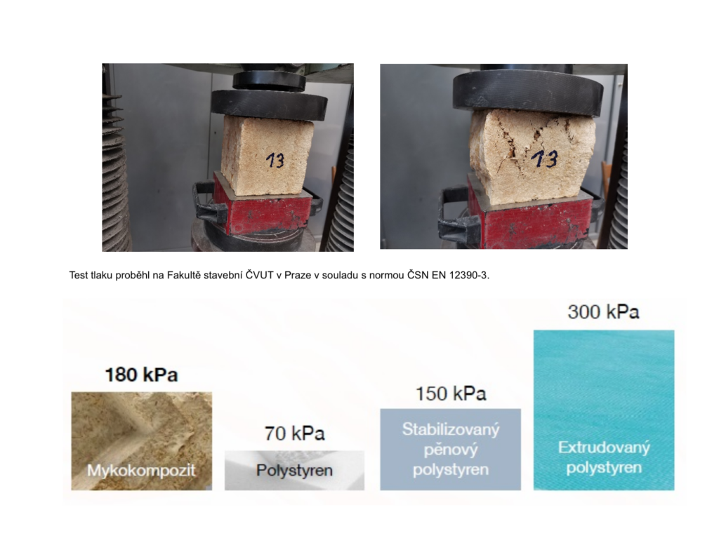 Jakému tlaku zvládne odolat mykokompozitní materiál? Zkouška probíhá postupným působením a zvyšováním síly na krychli o hraně 10 cm, dokud její deformace nedosáhne 10 %. Aby se kostka vyrobená z mykokompozitu deformovala o 1 cm, musel lis vynaložit sílu 1,96 kN. Taková síla odpovídá váze 199 kg (tolik váží třeba lev africký nebo tři dospělé ženy). Testování mykomkopozitu je specifické. „Mycelium při vysoušení zmenšuje svůj objem. Proto se kostky dávaly do forem, které byly o 6 mm větší a po vyschnutí se blížily rozměrům 10x10x10 cm. Jednotlivé velikosti kostek byly tedy mírně proměnlivé, a proto vynaložené síle 1,96 kN odpovídá tlak 180 kPa,“ vysvětluje Jiří Vele ze spolku MYMO.