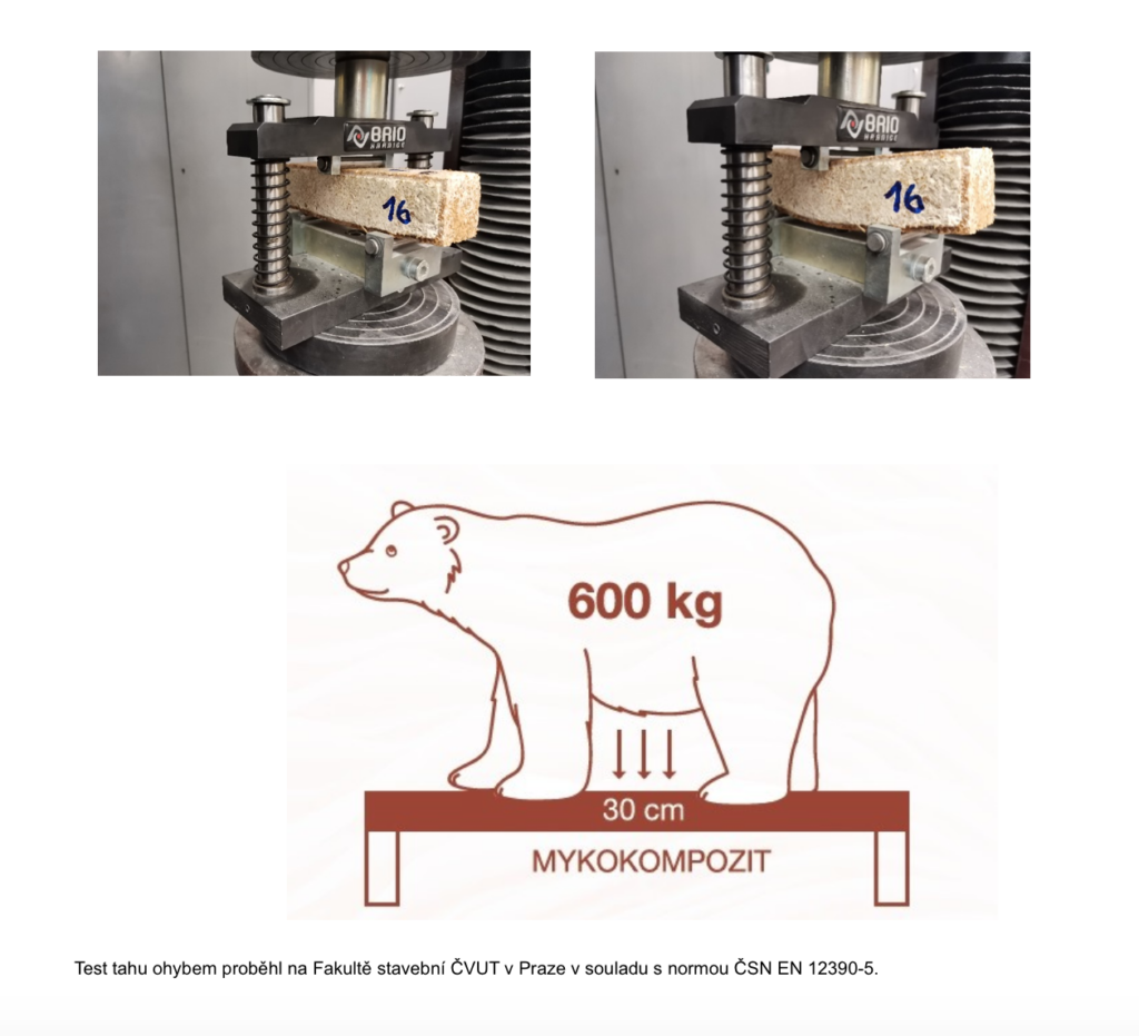 „Testovali jsme trámek o rozměrech 4x4x16 cm vyrobený z mykokompozitu. Na obou koncích jsme jej podepřeli a postupně jsme lisem vyvíjeli tlak na jeho střed, dokud nepraskl. Zjistili jsme, že vlastnosti mykokompozitu jsou srovnatelné s pevností korku. Je tedy pevnější než polystyren, ale méně pevný než dřevěné materiály. Takový výsledek znamená, že mykokompozit rozhodně není vhodný pro použití jako trám nebo nosník nesoucí další zatížení. Díky své nízké váze je však samonosný,“ říká Jiří Vele.