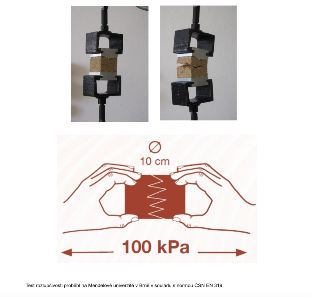 Zkouškou rozlupčivosti dokazujeme, jaká je vnitřní soudržnost materiálu. Kolik síly je potřeba vynaložit, aby se materiál roztrhl. Dozvíme se tak například, jestli se dvě k sobě přilepené desky roztrhnou dříve uvnitř hmoty, nebo v lepeném spoji. V praxi souvisí tyto výsledky třeba se způsobem montáže na stěnu. „Zjistili jsme, že k tomu, abychom rozloupli desku z mykokompozitu o rozměrech 42x400x600 mm, potřebujeme vynaložit tlak 100 kPa, což je obdobné jako v případě fasádního polystyrenu 70F,“ říká Matěj Róth ze spolku MYMO.