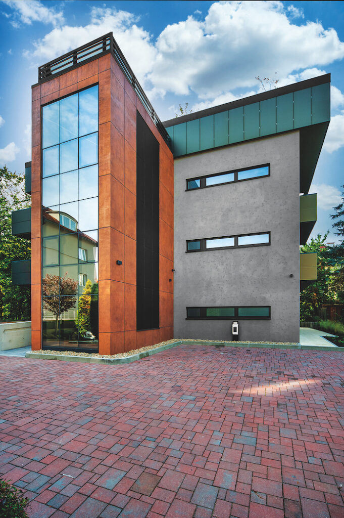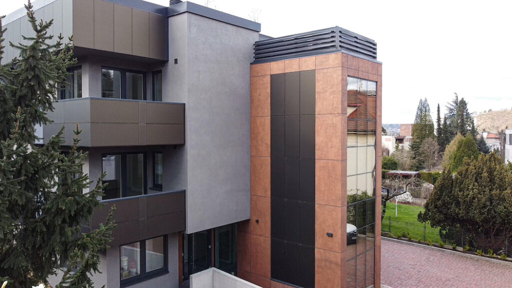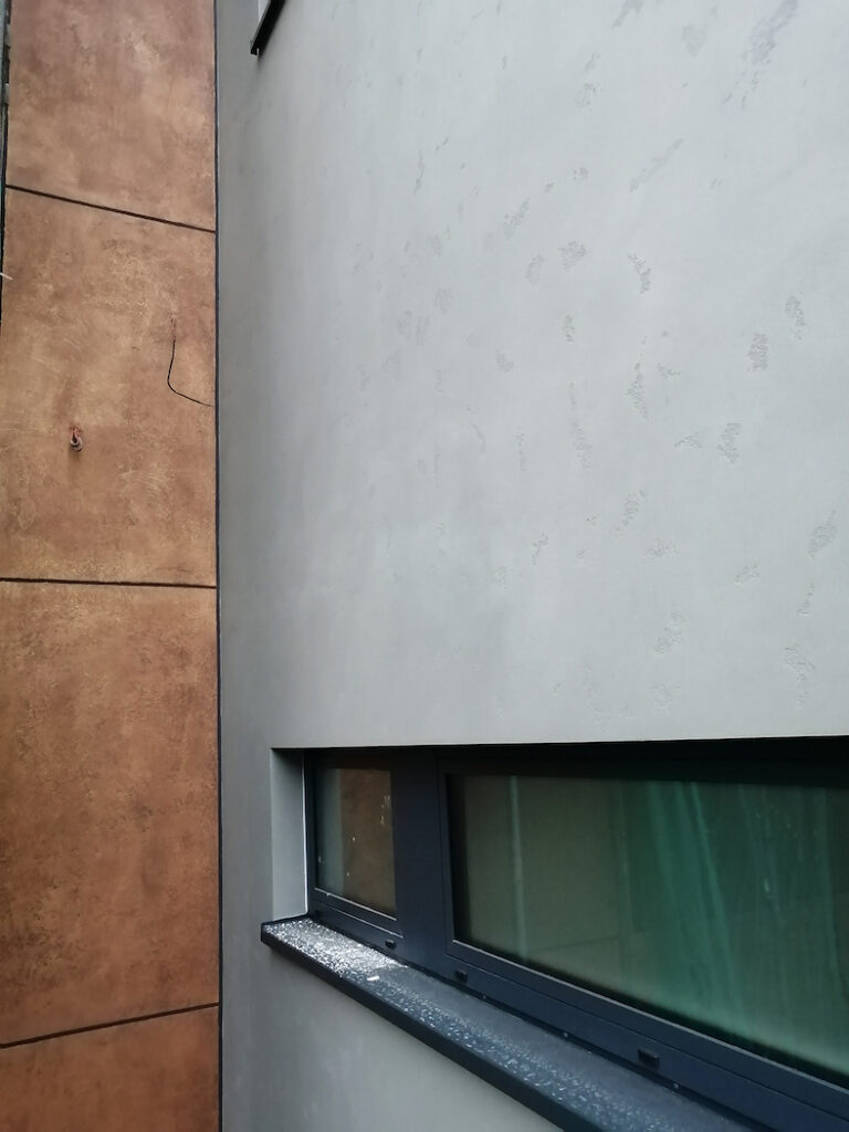 Ale vraťme se k realizaci domu v Holešovičkách. Různě hrubé až hladké povrchy fasády jsou tedy dány nejen zrnitostí omítky, ale též použitým nástrojem. V případě struktury zvoleného pohledového betonu se kombinovala omítka Baumit CreativTop Vario a v některých místech také její jemnější verze Baumit CreativTop Silk. Požadovaného vzhledu betonu bylo poté dosaženo dvoufázově za použití nerezového hladítka. Po zabroušení povrchu excentrickou bruskou následovala aplikace finálního nátěru Baumit Lasur v požadovaném odstínu. U povrchové struktury evokující zrezivělý plech à la korten byla základem omítka Baumit CreativTop Fine. Po jejím zaschnutí se následně natáhla druhá vrstva o silnější tloušťce za použití omítky Baumit CreativTop Pearl. Pomocí malířského válečku s vlasem se následně docílilo základní podoby povrchu zrezivělého plechu. V určitých místech se poté nerezovým hladítkem vytvořila hladká část struktury plechu. Tím byla vytvořena celková vizuální plasticita požadované struktury. Následným přebroušením, použitím celoplošného nátěru disperzní barvou Baumit Metallic Bronze a nakonec nanesením finálního nátěru Baumit Lazur 730L Mystic pomocí houby vznikla na části fasády bytového domu efektní metalická verze zrezivělého plechu.