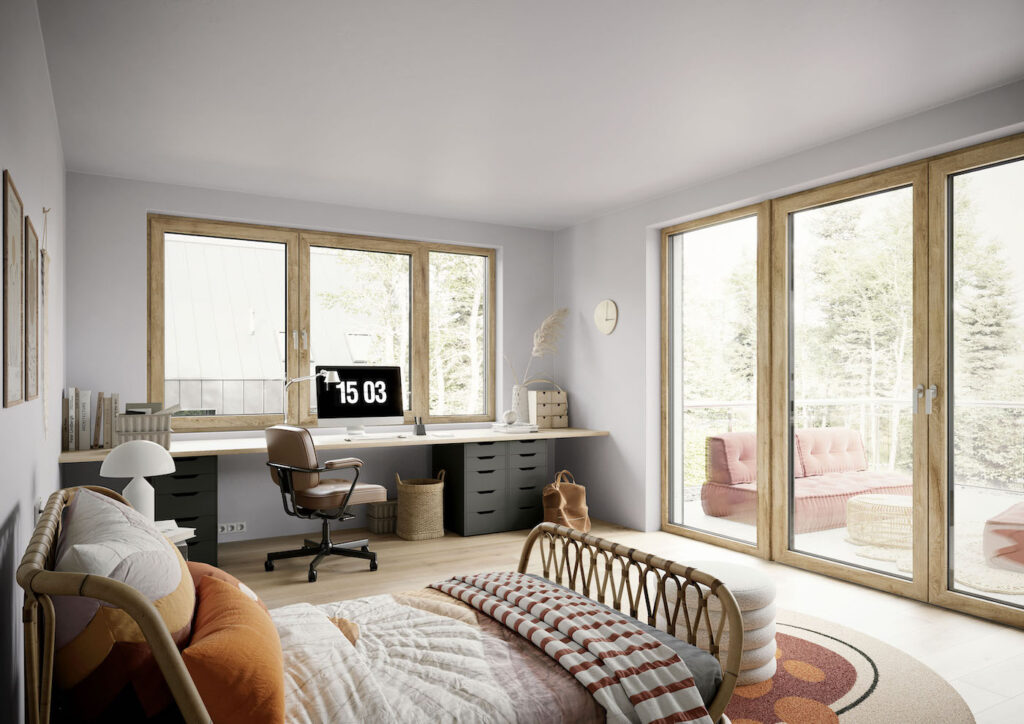 Matné dřevodekory řady KALEIDO WOODEC jsou extrémně zajímavé pro současnou moderní architekturu. Což je vidět i na některých stavbách převážně rodinných domů. Hodně zajímavá je v tomto ohledu kombinace designu dřevodekoru a barveného hliníku. Například světlý dub a tmavý hliník s probarveným profilem lze považovat za skutečně povedenou sestavu. Je možné ji vytvořit s pomocí hliníkových obložek, jež se nasazují na profil, nebo jednodušeji dekorem ze základní nabídky dekorů KALEIDO COLOR. Když vezmeme v potaz technické vlastnosti, pak to budou nejúspornější dřevo-hliníková okna na trhu. Dodejme na závěr, že ARTEVO profily obsahují v jádře větší množství recyklátu než kterýkoliv profil předtím, čímž se v rámci výrobního procesu zmenšila uhlíková stopa. ARTEVO okna jsou tedy veskrze moderní, ekologické systémy s obrovským potenciálem do budoucna a mají certifikaci pro pasivní domy.