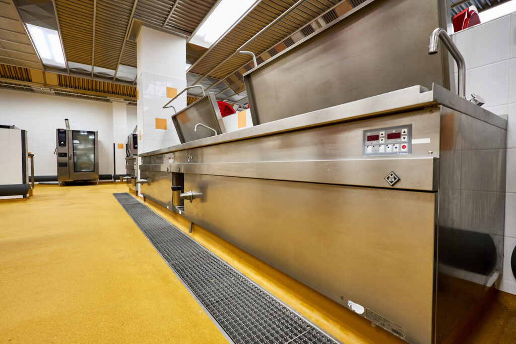 Výroba nerezových odvodňovacích van z potravinářské oceli 304 také nebyla jednoduchá. I ve složitých tvarech bylo nutné vést spádování dna žlabů do jednoho místa a současně se vyrovnávat s výškovým omezením podlahy.