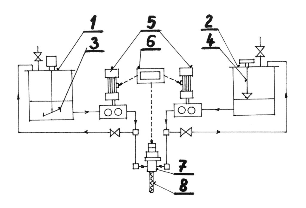 1, 2 – tlakové zásobníky složek A a B; 3 – míchadlo; 4 – hladinoměr; 5 – zubová nebo pístová čerpadla; 6 – řídicí jednotka; 7 – pistole NORDSON; 8 – statický mixér