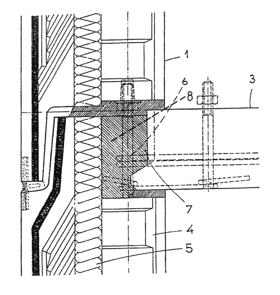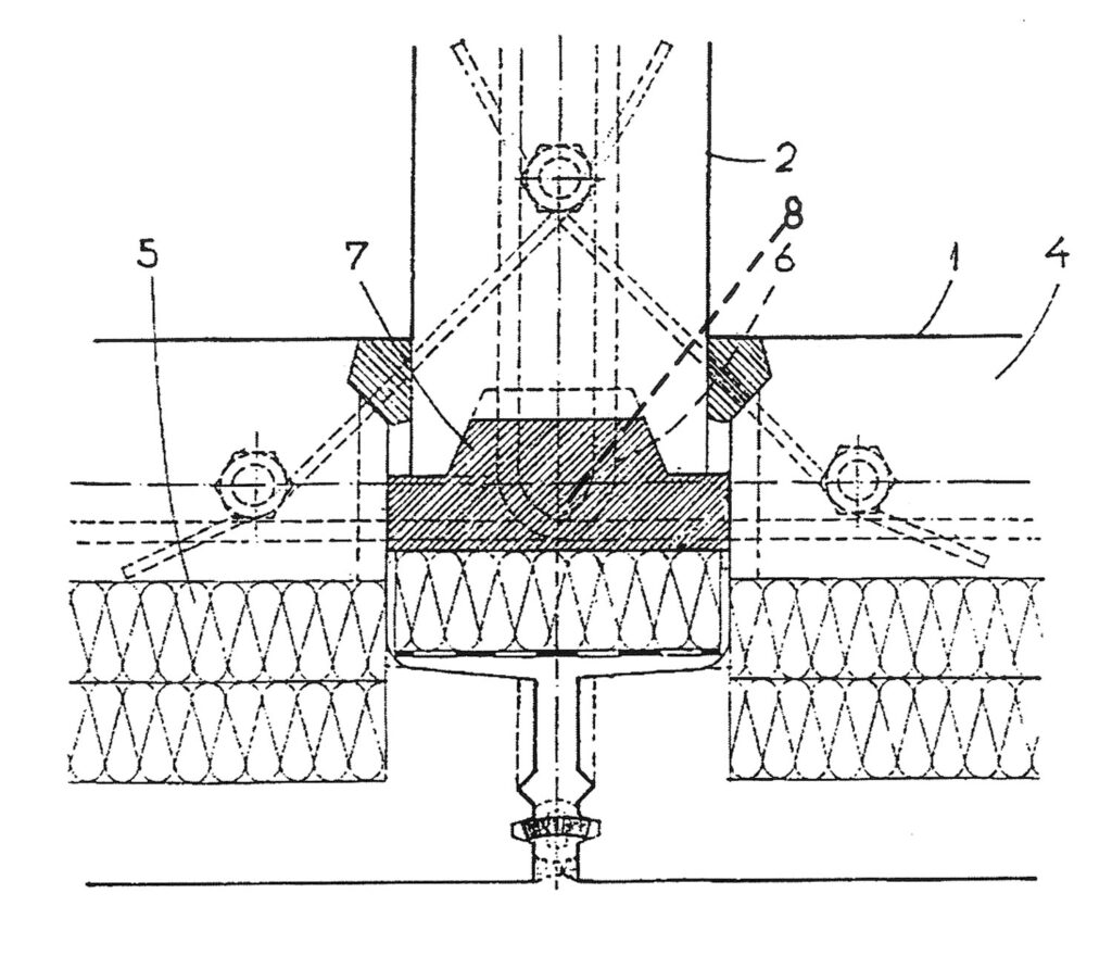 Z obr. 6 je zřejmý styk plášťových panelů 1 s panelem 2 příčné nosné stěny a z obr. 7 jejich styk se stropním panelem 3. Jako 4 je označena nosná betonová část plášťového panelu 1, jako 5 tepelná izolace, jako 6 vyčnívající ocelová výztuž určená ke svaření s výztuží 6 sousedního panelu. Konečně vztahovou značkou 7 jsou označeny komory – zvýrazněné šrafováním, které byly, v lepším případě, po smontování panelů 1, 2, 3 vyplněny betonem. Na obrázku jsou vyznačeny i vrty do uzlů čárkovaně. Do vyvrtaného otvoru v obvodové vnitřní stěně panelu se zasune pod úhlem cca 45° pakr (např. OPK 10/100 – M – 5), jehož průměr a délka se volí na základě provedené diagnostiky. Spojení se statickým směšovačem se provede pomocí tlakové hadice a pakrové spojky.