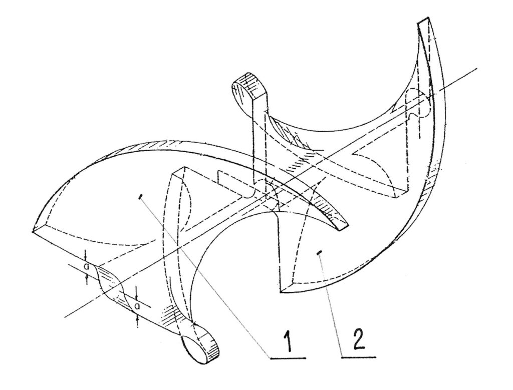 1 – přepážka s pravým zakřivením; 2 – přepážka s levým zakřivením