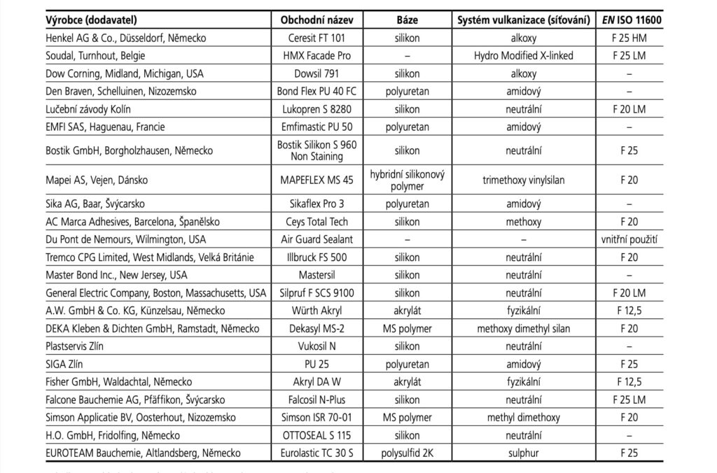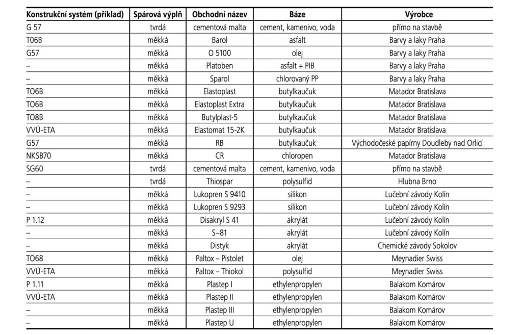 Pro jednostupňový způsob utěsňování byly postupně používány spárové výplně uvedené v tabulce 2.