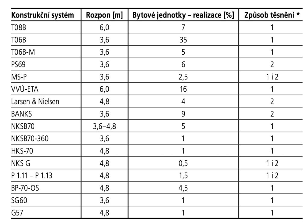 Zamezení vnikání vlhkosti a vzduchu do stavebního díla bylo řešeno utěsněním svislých a vodorovných spár mezi plošnými prvky buď jednostupňově, nebo dvoustupňově. Lze předpokládat, že celková délka spár v ČR se pohybuje kolem 40 milionů metrů. Přehled vybraných konstrukčních systémů v ČR je uveden v tabulce 1.