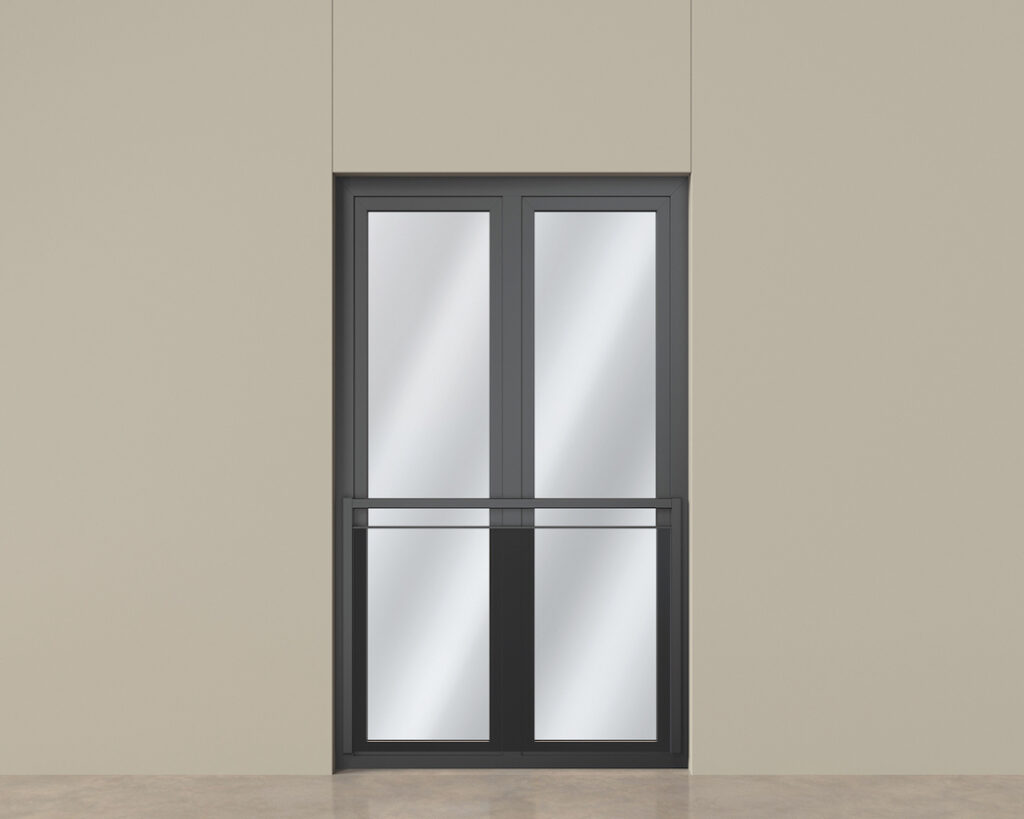 Dvoukřídlé okno na výšku místnosti Schüco FocusIng v kombinaci s bezpečnostním zábradlím.