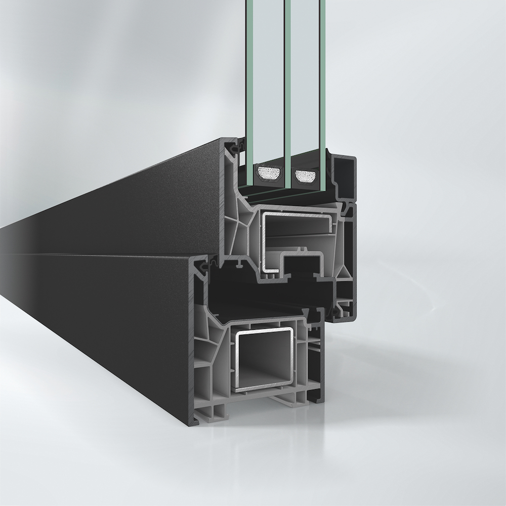 Nový plastový okenní systém Schüco FocusIng se designem maximálně přiblížil vzhledu hliníkových profilů, zvýšil podíl recyklovaného materiálu při výrobě, ale především nabízí dvojí stavební hloubku – užší hloubku rámu zapuštěného do konstrukce (pouze 70 mm), ale širší u samotného křídla (76 mm), což značně vylepšuje tepelněizolační parametry oken díky možnosti použít trojsklo o šířce až 52 mm.