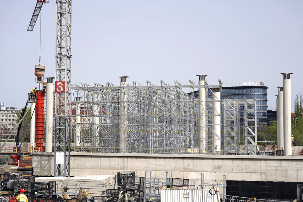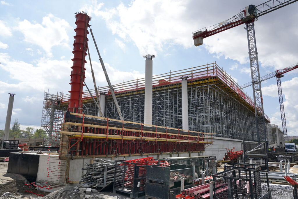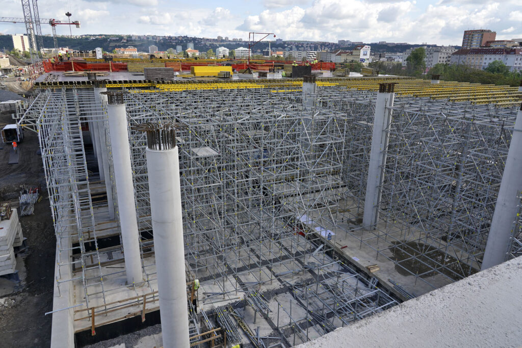 Strop nad 1. podzemním podlažím byl realizován pomocí osvědčeného nosníkového systému MULTIFLEX, který umožňuje přizpůsobení tvaru a zatížení podle potřeb stavby. V dalším nadzemním podlaží byl použit systém PERI UP jako podpěrná konstrukce stropu. Podpěrné konstrukce byly jednou z nejnáročnějších částí celé výstavby – bylo potřeba současně podepřít tři dilatační celky o celkovém objemu 75 000 m3, přičemž bylo nasazeno obrovské množství podpěr. Stavebnice lešení PERI UP zajistila rychlost montáže i schopnost přizpůsobit se různým výškám založení a rozdílným zatížením.
