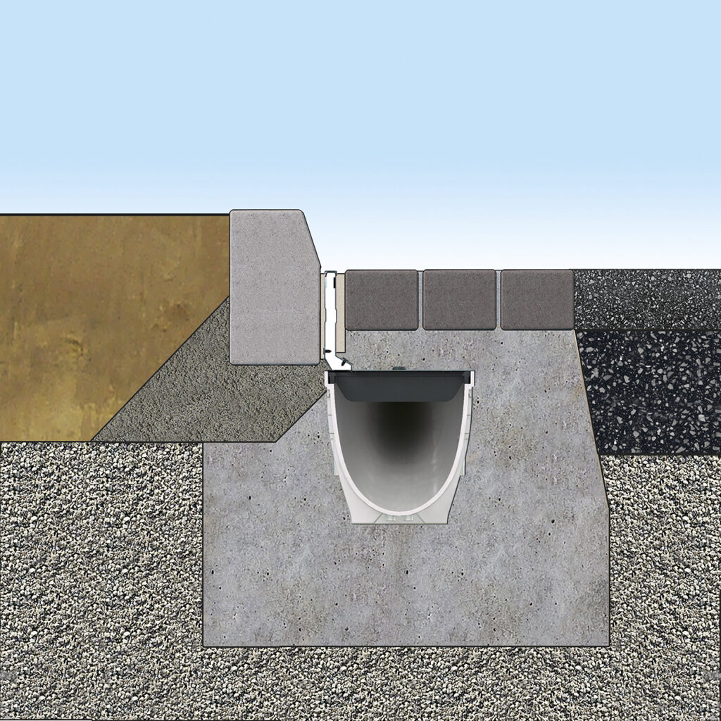 Toto řešení s liniovým systémem žlabů z SMC kompozitu je vhodné pro odvodnění ploch s malým nebo dokonce nulovým podélným spádem. Dno žlabů je spádované, takže vodu bezpečně odvede do jímek. SMC kompozit je velmi odolný materiál, který vydrží i přímý styk s horkým asfaltem, takže případná úprava přístupových cest nebude nijak omezena.