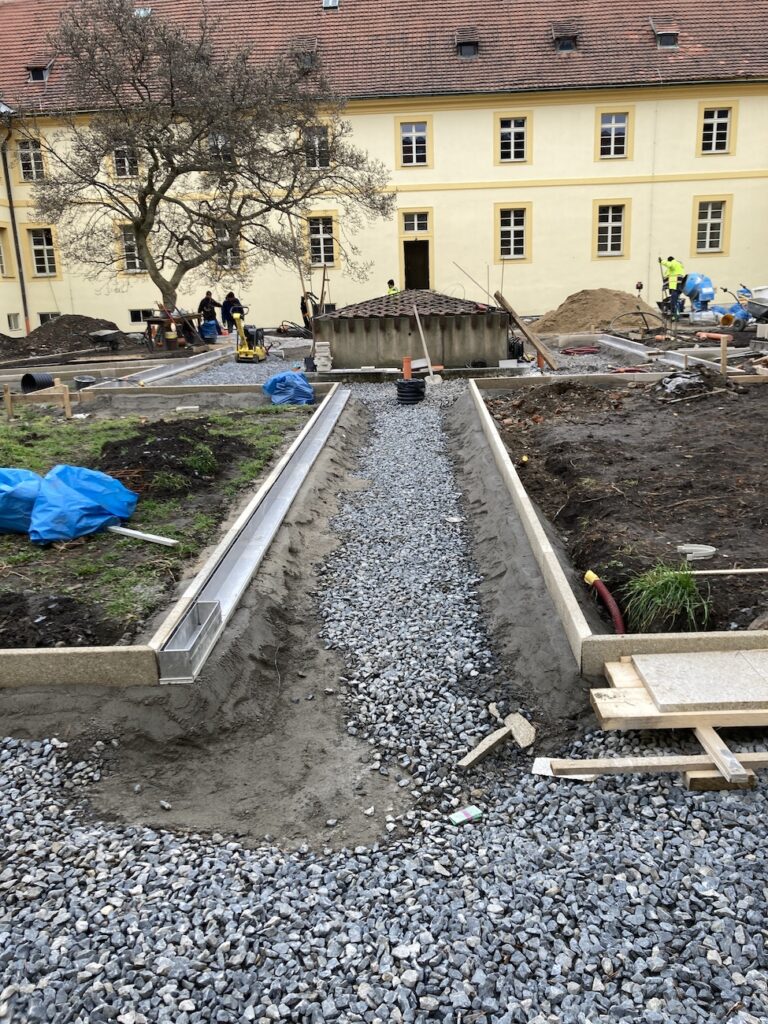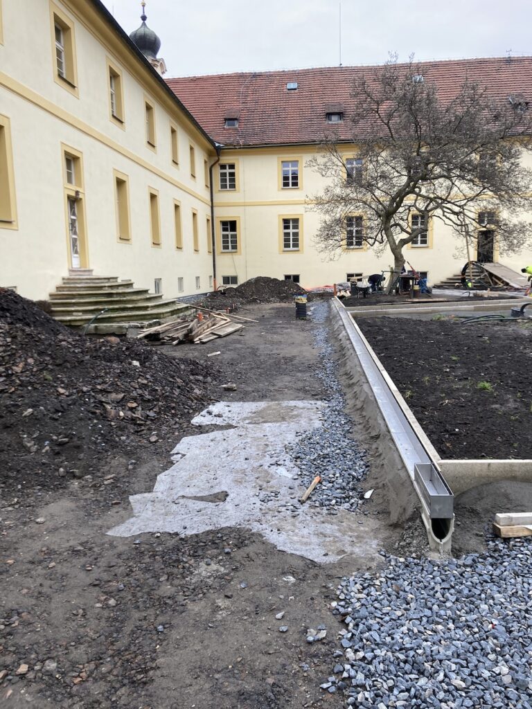 Na dvoře vznikají nové zelené a pochozí plochy pro pohyb pacientů i návštěvníků. Součástí změn je i vyřešení systému odvodnění a hospodaření s dešťovou vodou.
