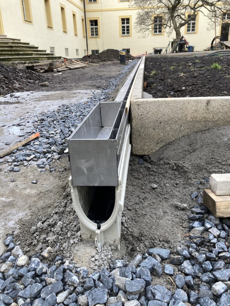 Projekční tým MEA navrhl systém žlabů MEARIN PLUS v kombinaci s nerezovými štěrbinovými nástavci TSL 1000.