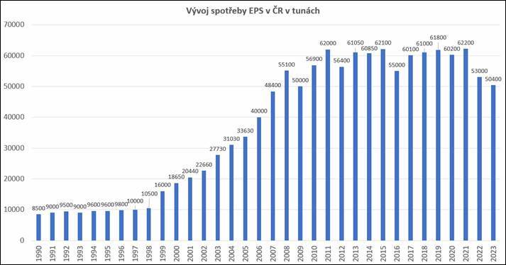 Výraznější pokles spotřeby EPS započal již v předloňském roce, na vině byl tehdy zejména rapidní nárůst cen energií spolu s vysokými úrokovými sazbami, což mělo dopad na celkový pokles produkce evropského chemického průmyslu. Výroba suroviny pro EPS tehdy oproti roku 2021 zaznamenala pokles o 6,2 %. To se propsalo i do tuzemské spotřeby, která v roce 2022 klesla na 53 tisíc tun, oproti rekordnímu roku 2021, kdy dosáhla 62 200 tun.