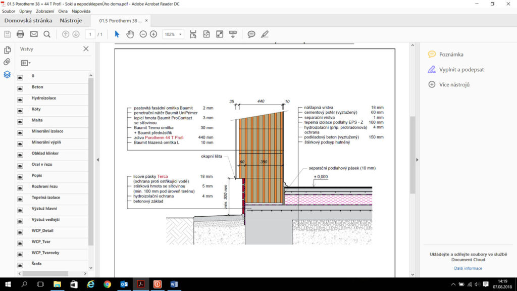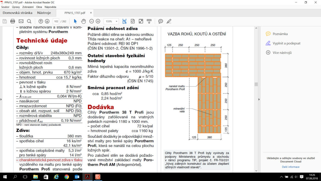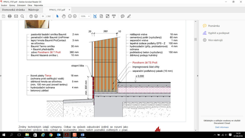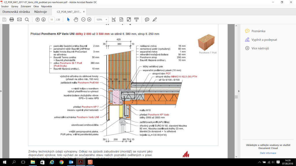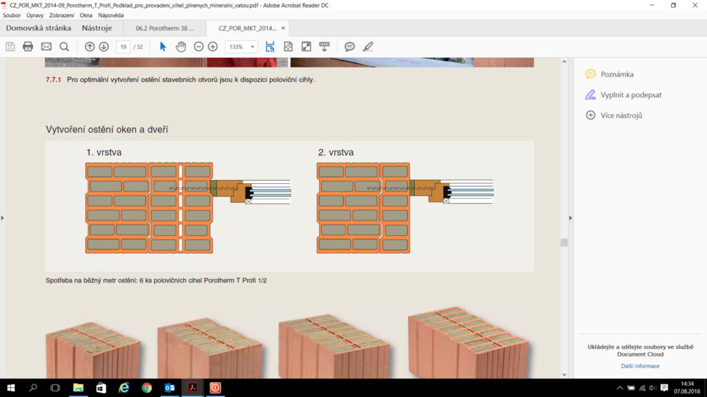 Pokud by se člověk díval při výběru materiálu Porotherm pro obvodové zdivo na jednoduchost realizace a nízké náklady, asi by zvítězil cihelný blok plněný minerální vatou Porotherm 38 T Profi se součinitelem prostupu tepla U = 0,16 W/m2K. Nerad bych tímto odsoudil jiné výrobky a tloušťky zdiva, ale proč je tomu tak, si ukážeme na násle dujících detailech stavby. Odpovídá tomu i pro dejnost tohoto výrobku, kdy společně s výrobkem Porotherm 44 T Profi s U = 0,14 W/m2K se jedná o nejvyhledávanější variantu obvodového zdiva.