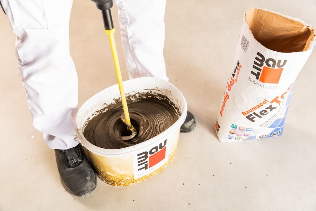 Baumit Baumacol FlexTop Speed – rozmíchání lepicí malty pro zrychlený proces lepení obkladů a dlažby a nanesení lepicí malty na podklad