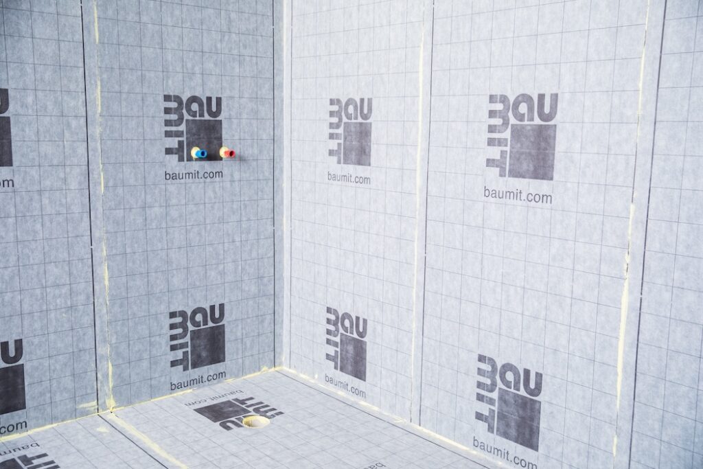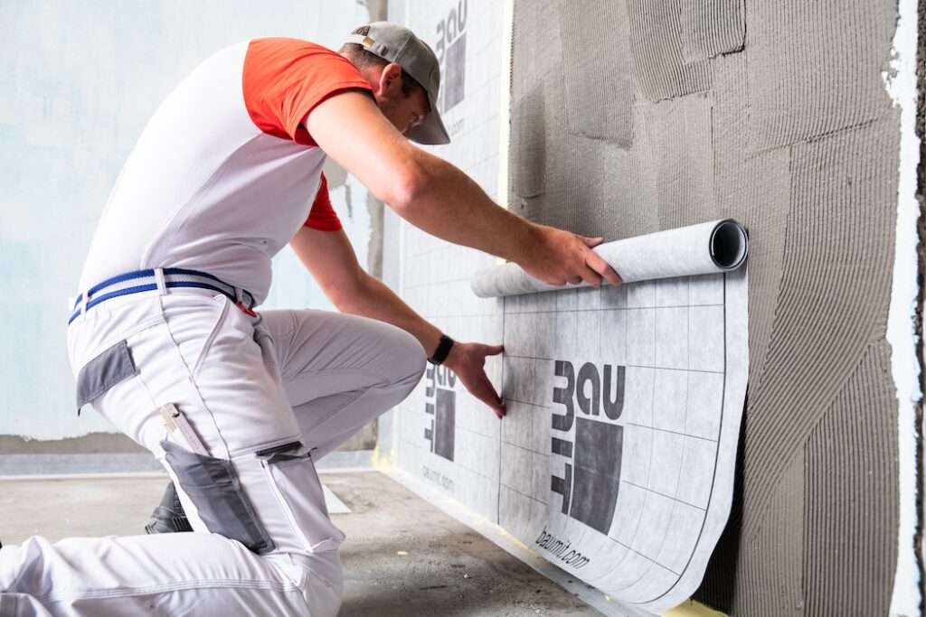Příprava na aplikaci hydroizolační folie Baumit AquaSafe a instalace hydroizolační folie Baumit AquaSafe pro zrychlený proces lepení obkladů a dlažby