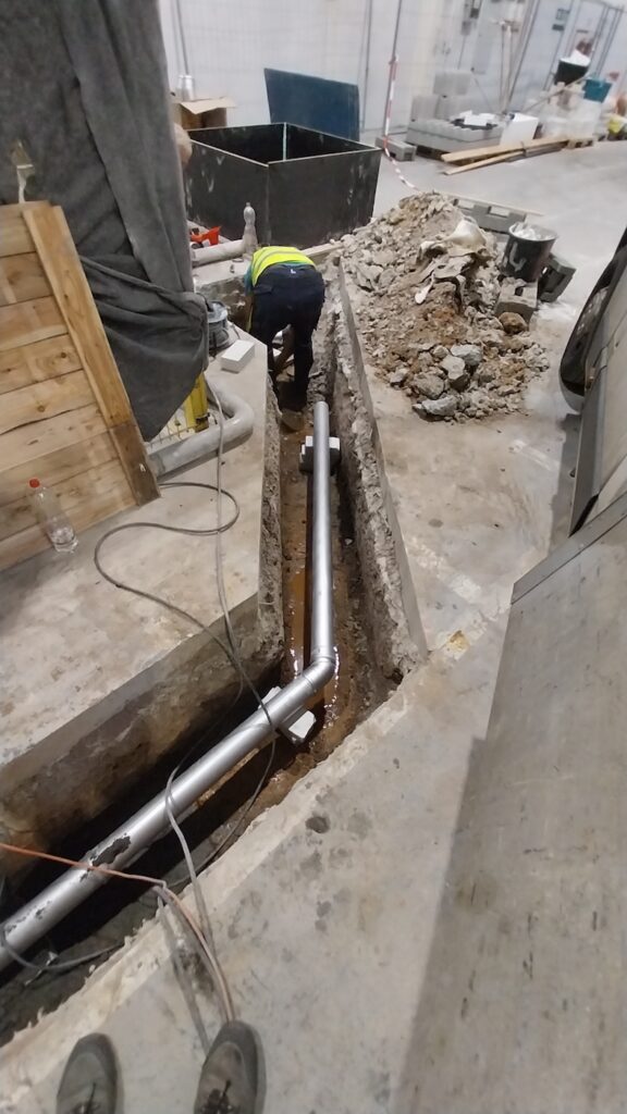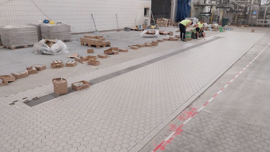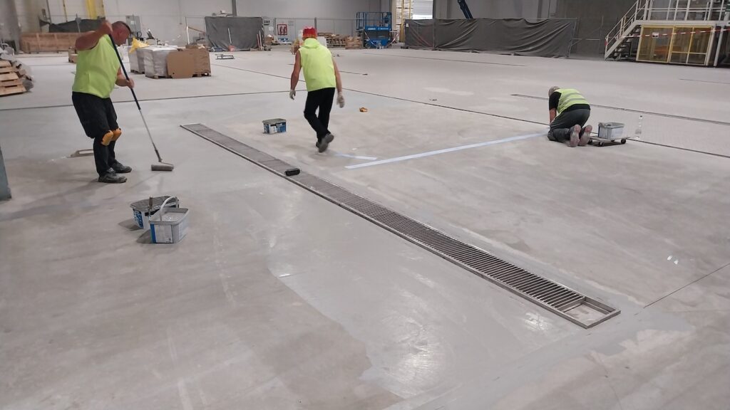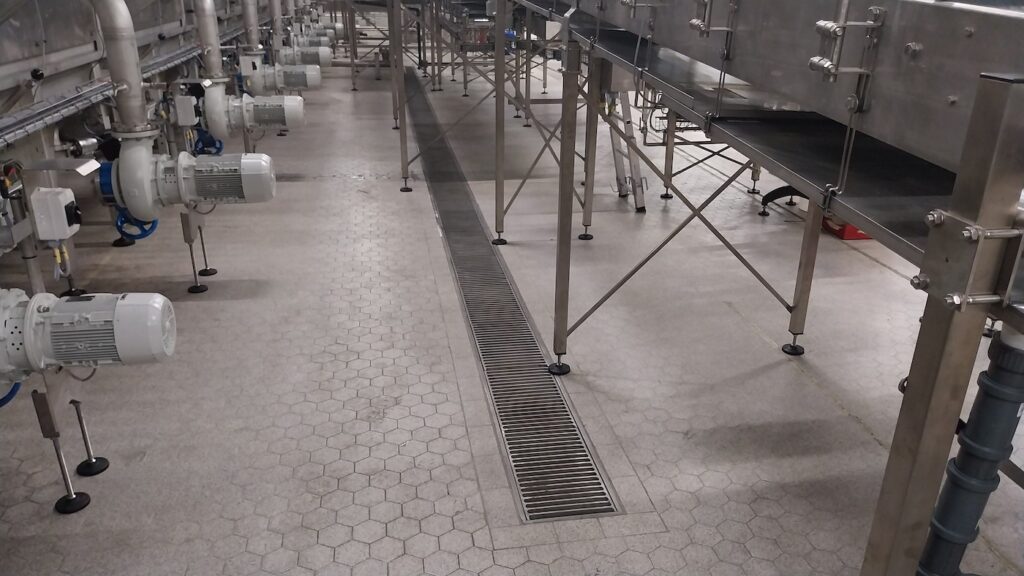 Nerezové žlaby MEA byly uloženy na podkladní beton a napojeny na nerezové potrubí. Vyrovnání bylo provedeno s pomocí stavěcích noh, následovalo přivrtání, zabetonování a položení kyselinovzdorné dlažby.