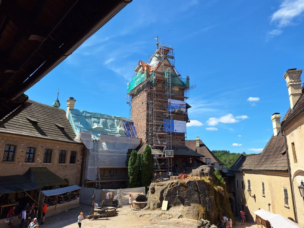 Oprava střechy na Lokti by měla trvat zhruba dva roky, provoz hradu ale omezen není. Každoročně hrad navštíví na 100 tisíc lidí, a tak bylo prvořadým úkolem zajistit bezpečnost návštěvníků pod lešením. Prací na turisticky exponovaném místě se zhostila realizační firma BOLID M s.r.o., která má s opravami památkově chráněných objektů bohaté zkušenosti. Podle stavbyvedoucího Petra Stránského jde ale v jistém smyslu o výjimečnou realizaci: „Střecha hradu je tvarově velmi členitá, zejména věž, tvarem se jedná o průnik křížové střechy s kuželovou. Proto se musí střešní tašky na místě hodně formátovat, přiřezávala se takřka každá druhá taška. S Opálem se naštěstí dobře pracuje a při úpravách nepraská.“ Řemeslníci se museli již v první fázi popasovat s celou řadou složitých stavebních detailů, jako skryté úžlabí vedené do oblouku. „Na střeše pracují jen opravdoví profesionálové v oboru, kteří ovládají tradiční pokrývačské a klempířské techniky. Bez nich by to nebylo vůbec možné,“ uzavírá Petr Stránský.