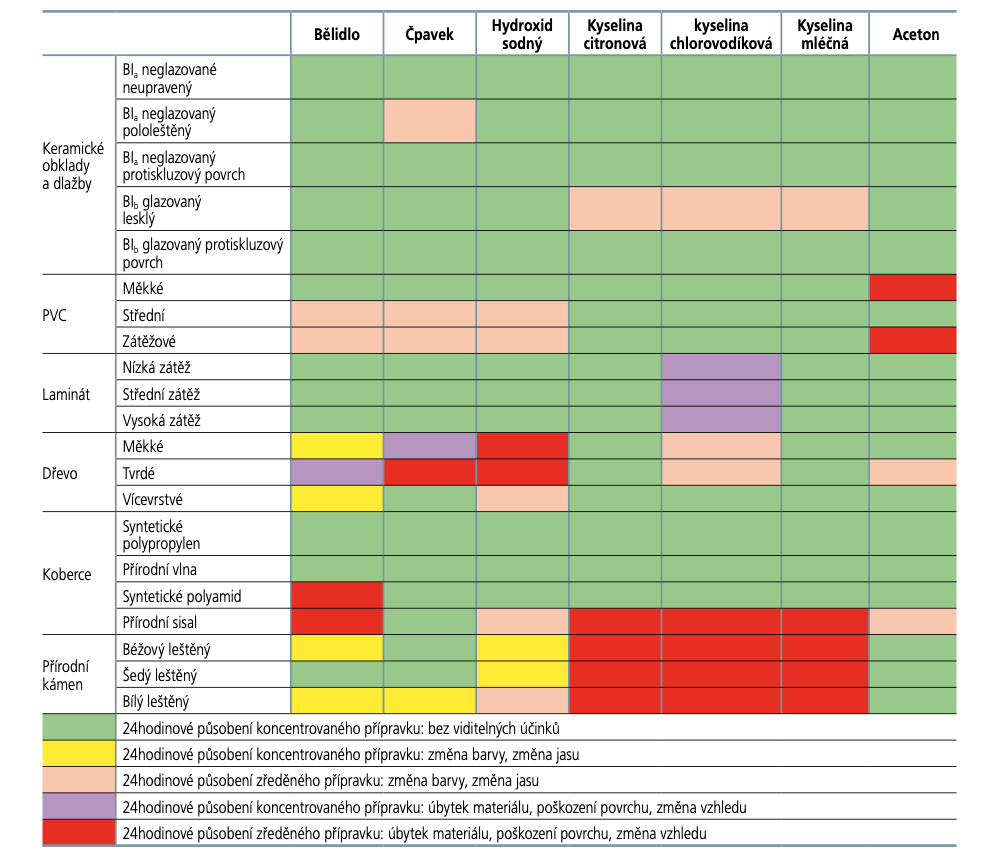 Ze všech testovaných vzorků je nejméně odolný vůči chemickým čisticím prostředkům přírodní kámen. Všechny testované vzorky vykazovaly pozoruhodné povrchové změny způsobené kontaktem s kyselinami (i při zředění a krátkodobém působení). Kontakt s chlornanem sodným, chloridem amonným a hydroxidem sodným způsobuje změny barvy a lesku.