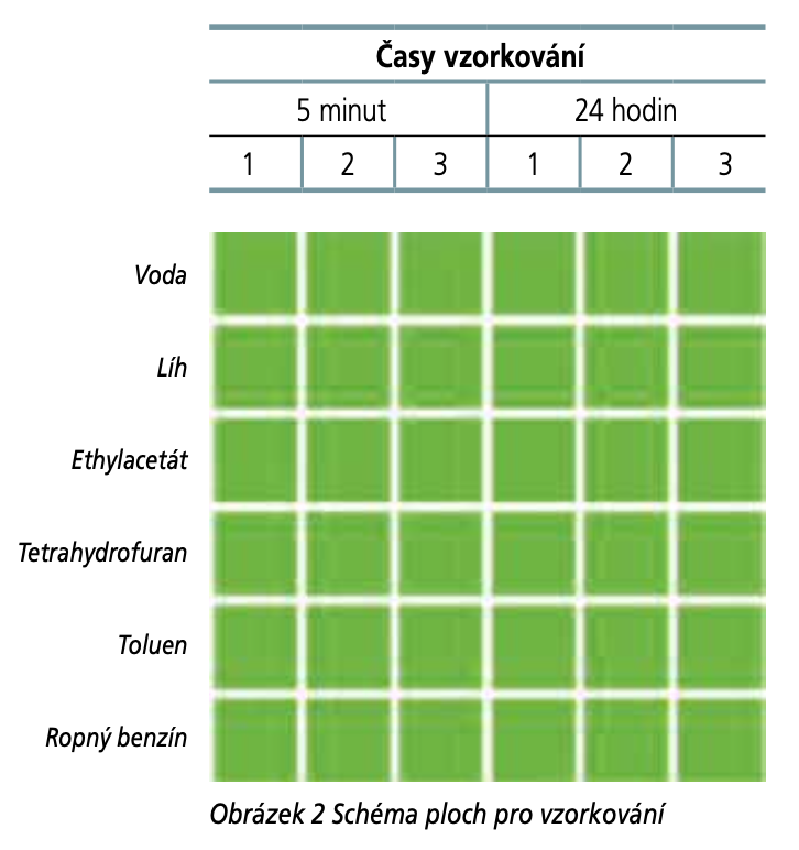 – náhodný únik: koncentrovaný (běžně prodávaný) přípravek se umístí na 24 hodin do kontaktu s povrchem;