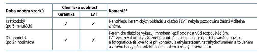 Na toto téma jsou níže shrnuty tři studie, které testují chemickou odolnost různých podlahových výrobků. Tyto testy se provádějí podle zvláštních předpisů (normy řady ČSN EN ISO 10545) nebo simulují skutečné podmínky, jako jsou běžné podmínky čištění nebo náhodné rozlití výrobku na podlahu. Reprodukovány jsou dva scénáře: v prvním případě je rozlitý prostředek rychle odstraněn, zatímco ve druhém nikoli a zůstane na povrchu po dobu jednoho dne.