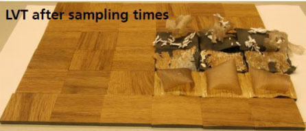 Jeden ze vzorků LVT byl poškozen alkalickým roztokem hydroxidu draselného v nízké (30 g/l) i vysoké (100 g/l) koncentraci, což ukazuje na nízkou odolnost vůči všem alkalickým čisticím prostředkům.