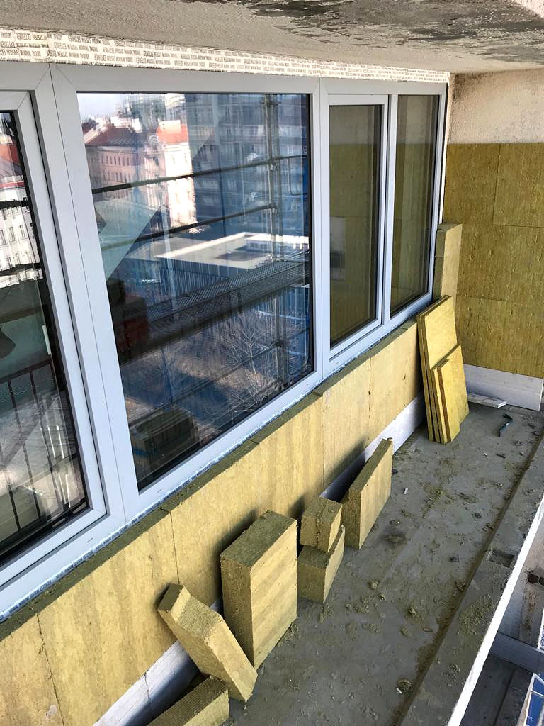 Izolant hlavní plochy se k podkladu lepil minerálním, cementem pojeným lepidlem s organickými zušlechťujícími přísadami. Izolant pod úrovní terénu a do výšky 0,5 m nad terénem se kvůli ochraně proti vlhkosti lepil dvousložkovým bitumenovým lepidlem bez obsahu rozpouštědel. Zateplení hlavní plochy fasády, ostění a nadpraží oken je z desek z minerální vaty s podélnou orientací vláken (deklarovaný součinitel tepelné vodivosti desek λd = 0,036 W/mK). Zateplení soklu izolačními deskami Perimetr (součinitel tepelné vodivosti λd = 0,034 W/mK).