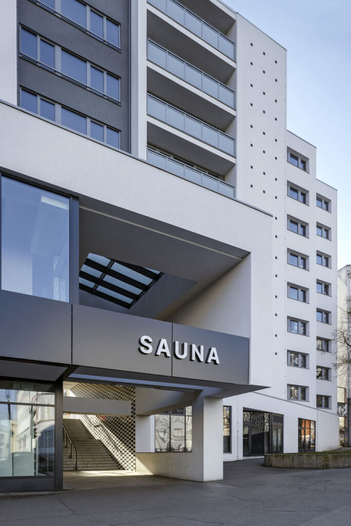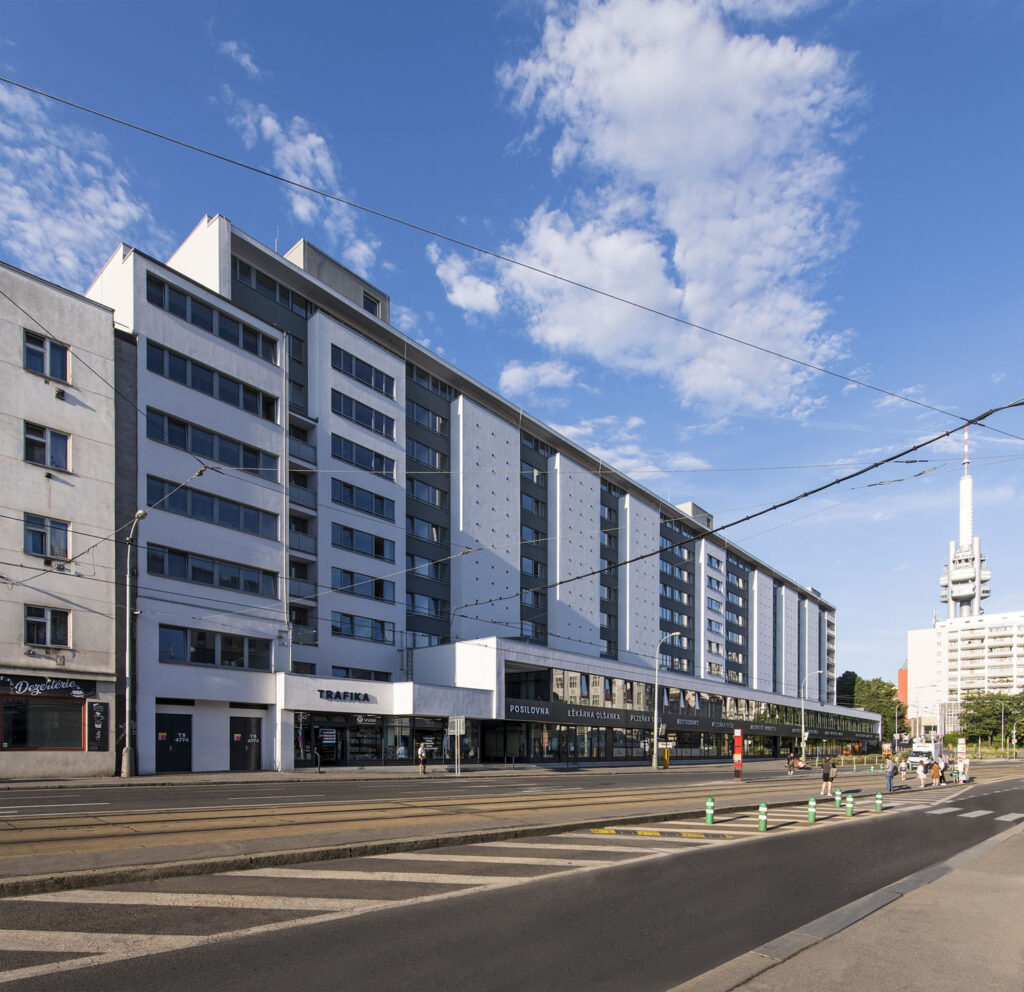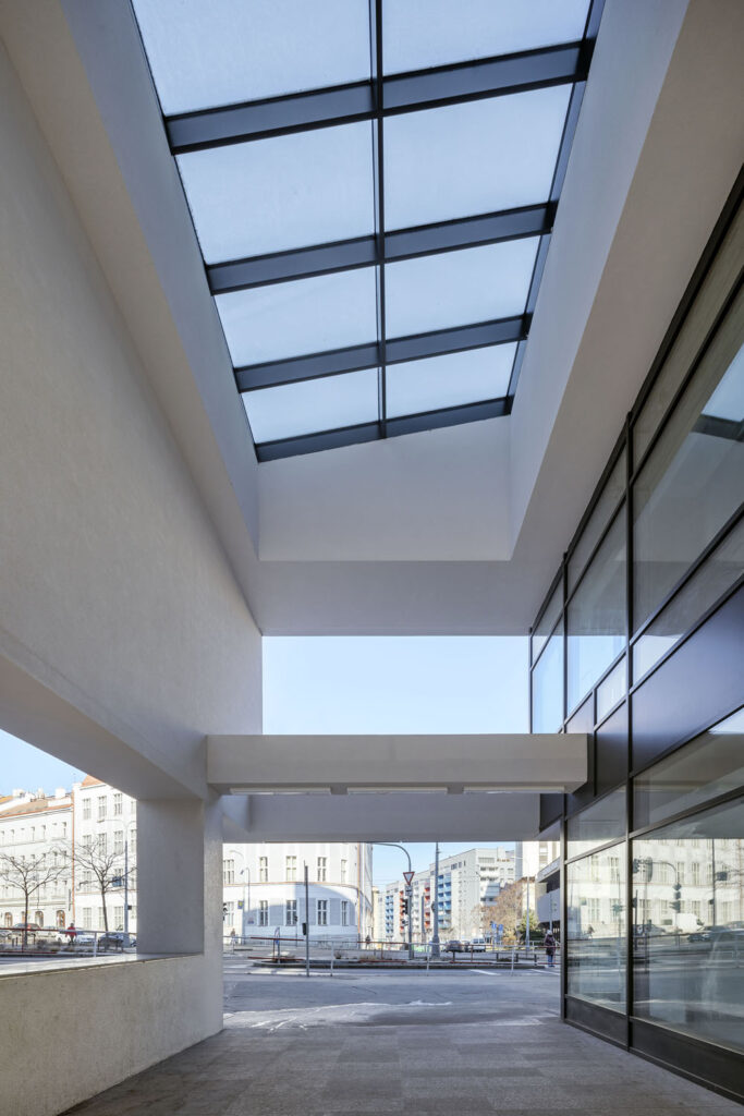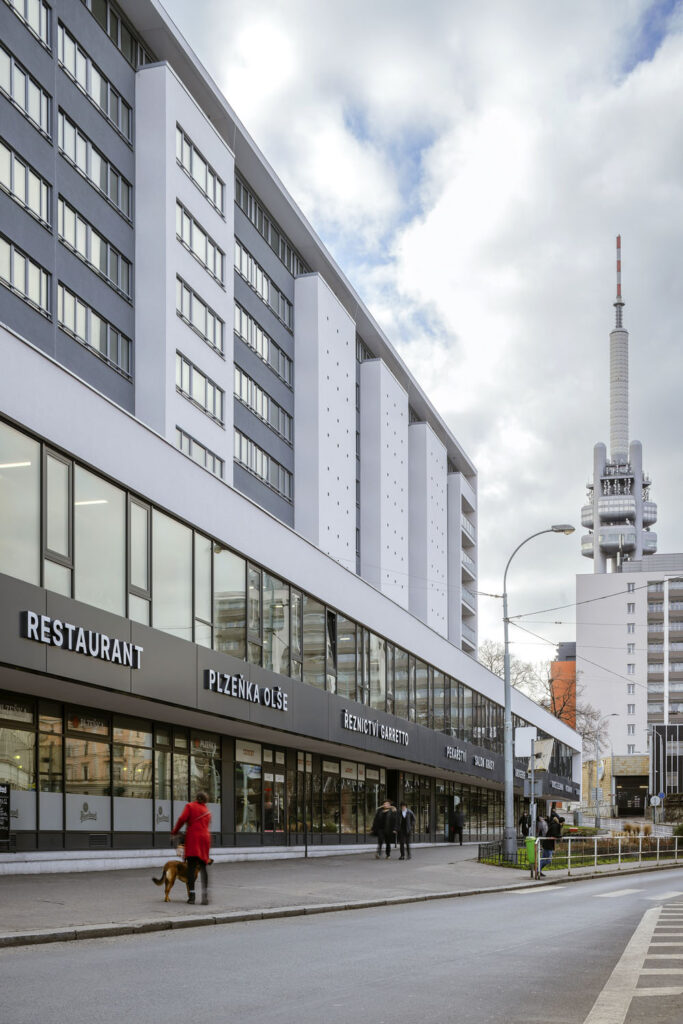 Výsledek je po rekonstrukci důstojný a příjemný – dům byl zateplen, dostal bílou omítku s šedými detaily, proměnil se i výrazný skelet předsazeného parteru, kde zůstaly obchody a přibyly kavárny. Rozsvítila ho prosklená fasáda v 2. NP, boční štítové stěny jsou teď plné. Spolu s otevřením některých nebytových prostor do rozšířených průchodů autoři dosáhli dojmu krátké pasáže.