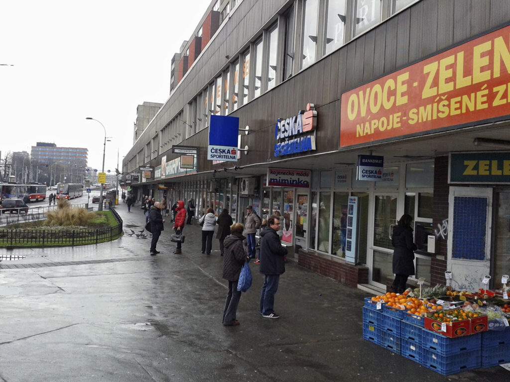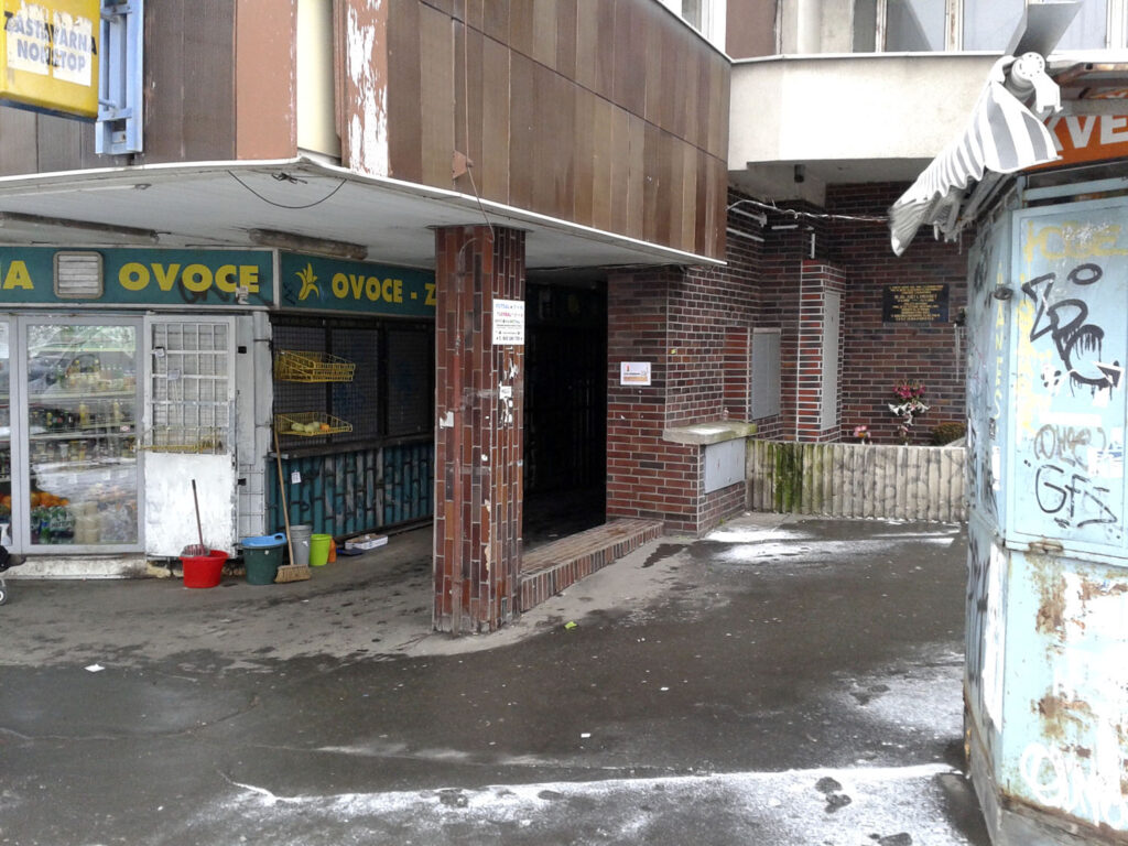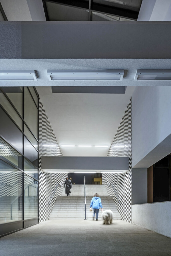 „Rozhodli jsme se dát severnímu průčelí nový charakter, původně jsme ale předpokládali, že panelové fasády chodeb a schodišť odstraníme a nahradíme je celoprosklenou stěnou, která spojí rizality sklípků. Z technických i cenových důvodů pak byla zvolena varianta prosklených stěn s parapetem. Plné rizality sklípků jsme zbavili barevného a materiálového akcentu, odstranili jsme také nevyužívané lodžie před dvěma krajními schodišti, jejich vnitřní obvodový plášť nahradila prosklená fasáda. A kromě toho se zlepšil také tepelně-technický standard stavby,“ uvádí architekt Petr Benda a dodává: „Úprava jižního průčelí spočívala především v novém barevném pojednání s rozlišením logických tvarových celků. Zábradlí lodžií jsme vyměnili, jsou tu desky s probarvenou omítkou nebo zábradlí prosklené. Průchody jsme rozšířili včetně schodišť přes téměř celý šestimetrový modul panelové soustavy VVÚ ETA. Manipulační a skladové prostory byly upraveny tak, aby veřejnost měla přístup na střechu podzemních garáží. Zjistili jsme také, že mnozí obyvatelé domů mají potíže s hlukem, který způsobuje zásobování obchodů v ranních hodinách. Navrhli jsme proto dva kryté koridory se subtilním ocelovým skeletem krytým polykarbonátem. V podélném směru jsme je doplnili pergolami. Podpory pergol i koridorů budou osazeny v betonových prefabrikovaných vanách pro popínavou zeleň. Vznikne tak alespoň částečně zastíněný venkovní prostor, který může být zčásti využit jako předzahrádka bistra, případně vybaven herními prvky pro děti. Tato etapa stavby nás však čeká až po rekonstrukci střechy podzemních garáží.“
