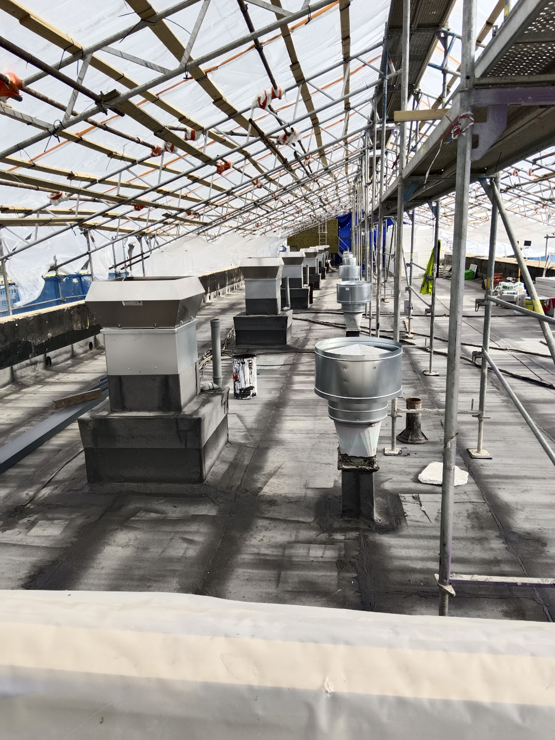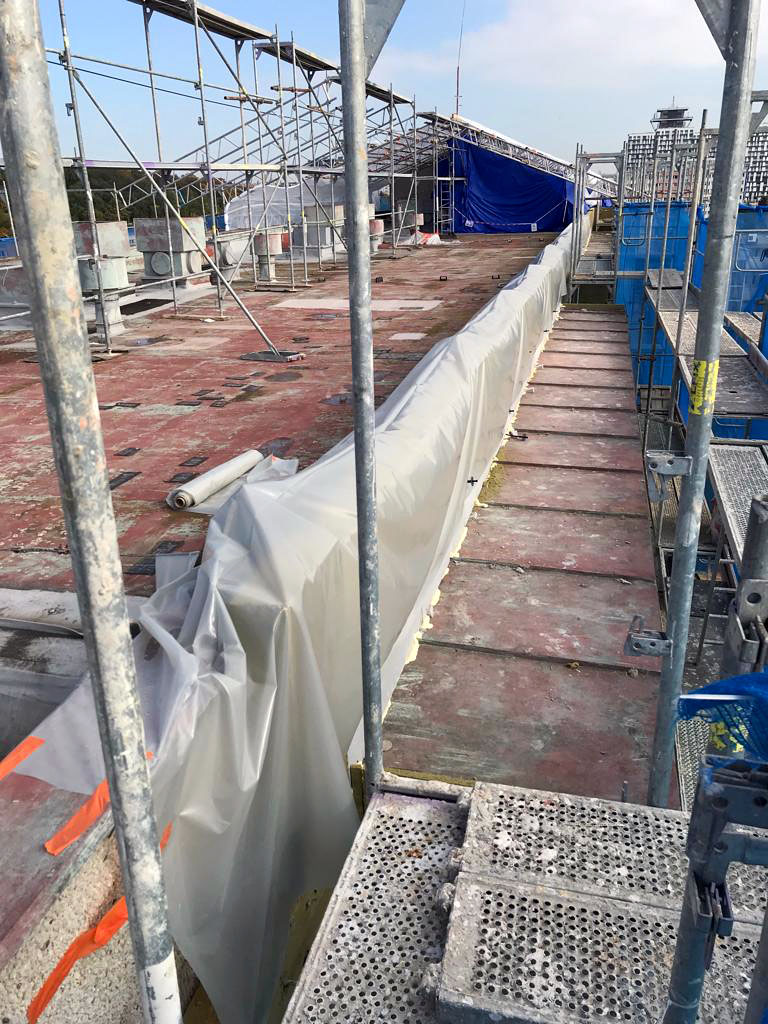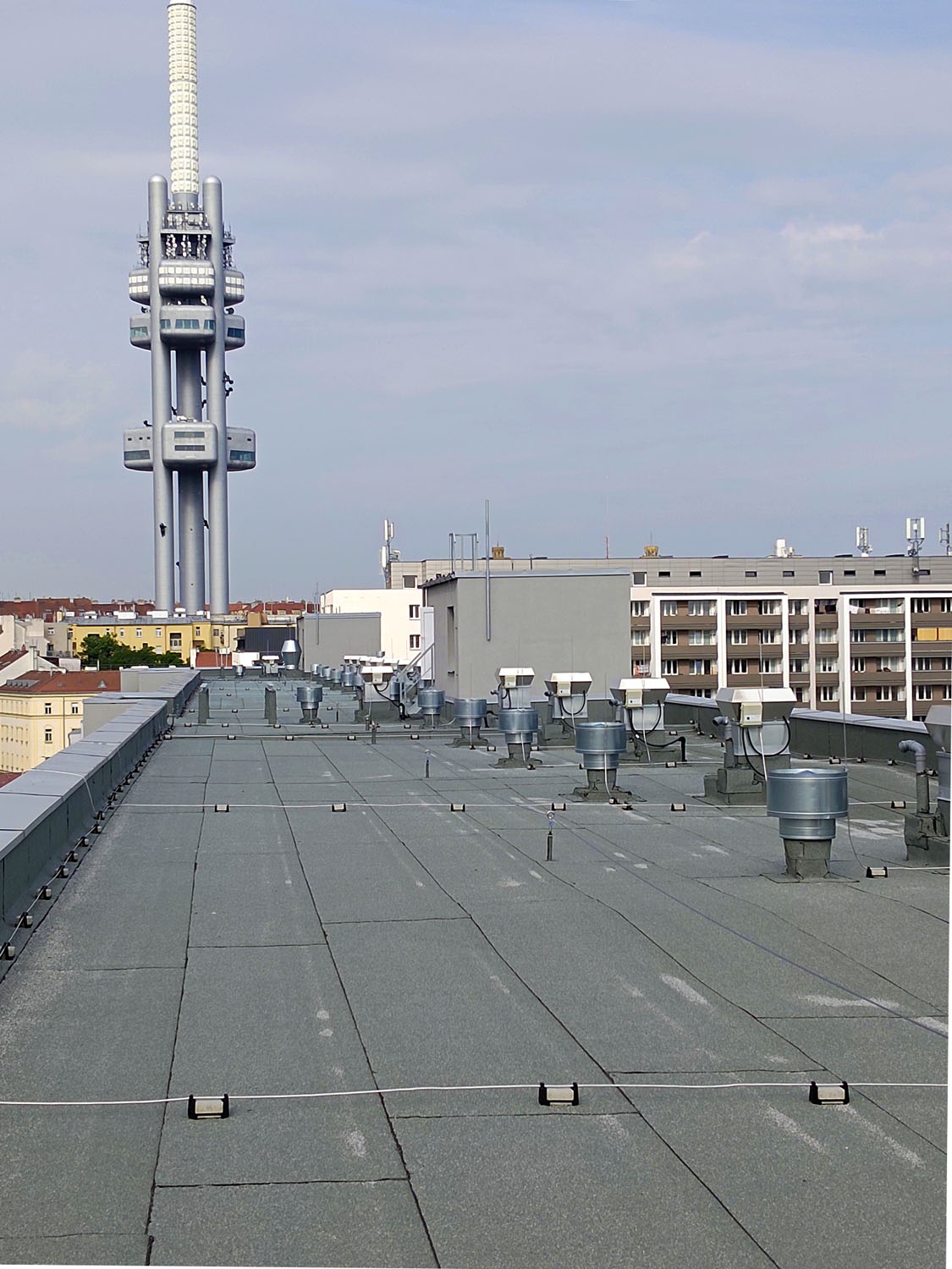 „Před zbudováním nového pláště bylo nutné odstranit a zlikvidovat izolaci, která patřila do kategorie nebezpečného odpadu. Jednalo se o asfaltové pásy, které se tehdy vyráběly s obsahem azbestu, což doložily i laboratorní zkoušky. Během let navíc došlo k propojení vrstvy hydroizolace a části tepelné izolace z expandovaného polystyrenu, i tyto desky bylo třeba likvidovat jako nebezpečný odpad. Povrch panelu jsme v souladu se zadáním po odstranění původních vrstev vyspravili aplikací syntetické stěrky (plastbetonem) v tloušťce 5 mm. Střešní plášť jsme realizovali včetně veškerých klempířských prvků a konstrukcí. Součástí střechy jsou kromě klempířských výrobků další konstrukce, které střešní plášť doplňují a tvoří celek. Jedná se například o konstrukce pro osazení antén a satelitů nebo o zřízení umělých hnízd pro rorýsy,“ upřesňuje inženýr Nýč a dodává: „V celém objektu se vyskytovaly materiály s obsahem azbestu, které jsou nebezpečné pro lidské zdraví, a obzvláště v obývaném domě je třeba přistoupit k jejich likvidaci. Provádí se to po tzv. kontrolovaných pásmech, kdy je každé z nich neprodyšně uzavřeno a práce probíhají ve speciálním stanu. Po odstranění všech materiálů s obsahem azbestu byly stany otevřeny tak, aby se pod nimi mohly realizovat nové střešní skladby. Po dokončení střechy v daném pásmu se stavba posunula dál. Tento postup však omezil rychlost výstavby, nebylo ani možné využít původně zamýšlené věžové jeřáby pro zásobování stavby a také pro odvoz materiálu. Nakonec jsme to vyřešili třemi stavebními výtahy.“